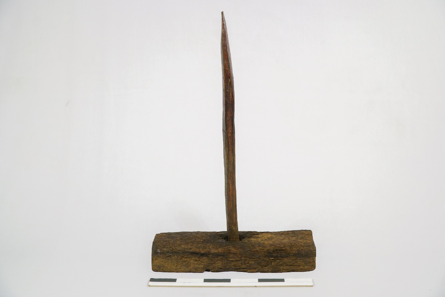Terbuat dari tanah liat, bentuk bulat cekung dan berkaki rendah, retak seribu, berglasir warna abu-abu. Bibir rata tanpa glasir dan sompel satu bagian, pada bagian tengah/dasar atas terdapat cap motif flora di dalam lingkaran biskwit. Dinding bawah beralur-alur lingkaran timbul, pada permukaan atas dan bawah sebagian terdapat sisa-sisa karang laut yang menempel. Cina, Dinasti Sung abad 10-13 M.