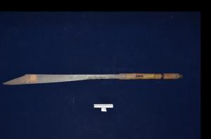 Terbuat dari tanah liat, bentuk bulat cekung dan berkaki rendah, berglasir warna abu-abu. Bibir rata membalik ke luar, pada bagian tengah/dasar atas terdapat cap motif flora yang sudah pudar atau tidak jelas di dalam lingkaran biskwit, dinding atas dan bawah polos, dasar bawah rata tanpa glasir. Pada permukaan atas dan bawah pada saat ditemukan tertutup karang laut . Cina, Dinasti Sung abad 10-13 M.