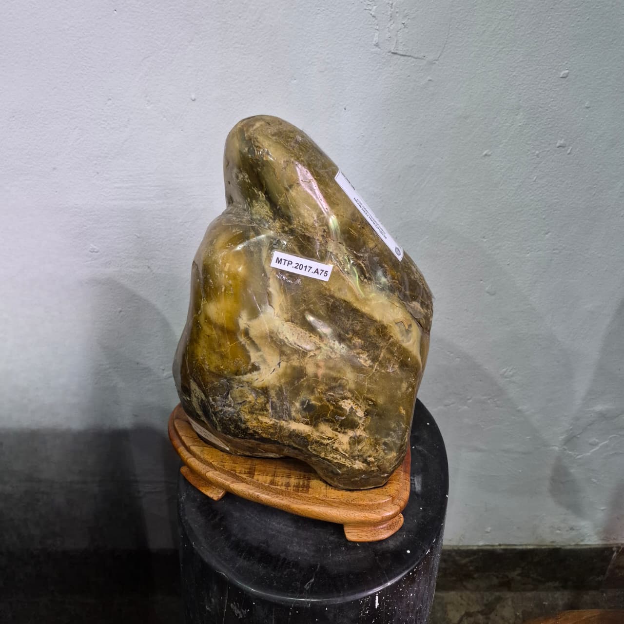Terbuat dari tanah liat, bentuk bulat cekung dengan glasir warna abu-abu. Pada bagian dalam terdapat lingkkaran biskwit dan dinding bagian luar dihiasi motif flora. Cina, Dinasti Ching, abad 18/19 M. Digunakan untuk wadah sajian makanan.