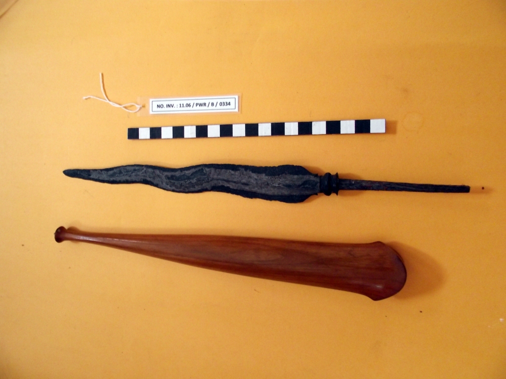 Terbuat dari tanah liat, bentuk bulat cekung dan berkaki rendah, berglasir warna abu-abu. Bibir rata membalik ke luar, pada bagian tengah dalam terdapat garis melingkar warna biru, dinding bagian luar dihiasi motif sketsa tanaman air dan garis-garis vertikal berwarna biru, dasar bawah rata. Cina, Dinasti Ching abad 17-18 M.