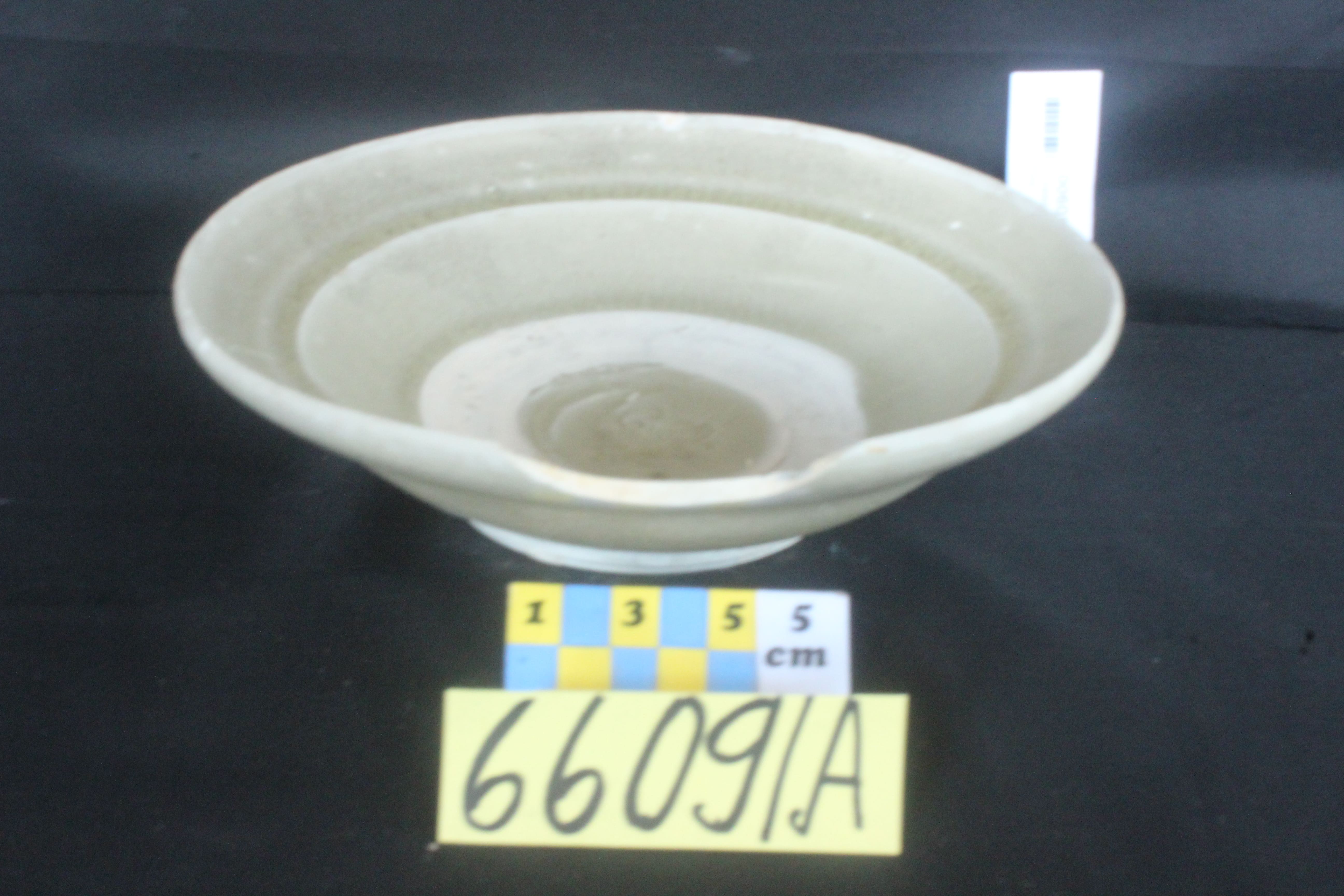Terbuat dari tanah liat, bentuk bulat cekung dengan glasir warna hijau seladon, retak seribu. Bibir rata membalik ke luar dan pecah cukup besar pada salah satu sisinya. Berkaki agak tinggi, dasar rata tanpa glasir. Cina, Dinasti Sung abad 12-13 M.