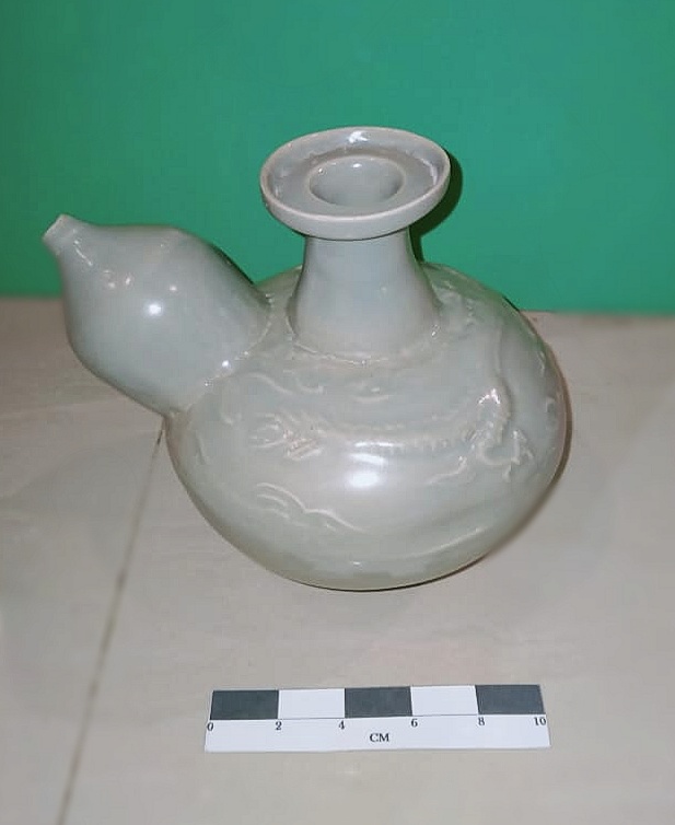 Terbuat dari tanah liat, berglasir warna hijau, bentuk bulat cekung. Bibir tebal membalik ke luar, kaki rendah dan tebal terdapat pasir-pasir yang menempel (krak). Badan polos, pada cekungan atau bagian tengah dalam terdapat relief bunga yang sudah pudar.