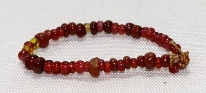 Manik manik kaca translucent (tembus pandang) ini disusun membentuk satu untaian berjumlah 50 buah. berbentuk bulat cakram dan berwarna kuning, merah terang, merah muda, coklat kekuningan dan coklat tua. Dilihat dari ciri-cirinya manik-manik kaca ini termasuk jenis indo pasifik, yang dibuat melalui teknik gulung (wound). Berfungsi sebagai benda perhiasan.