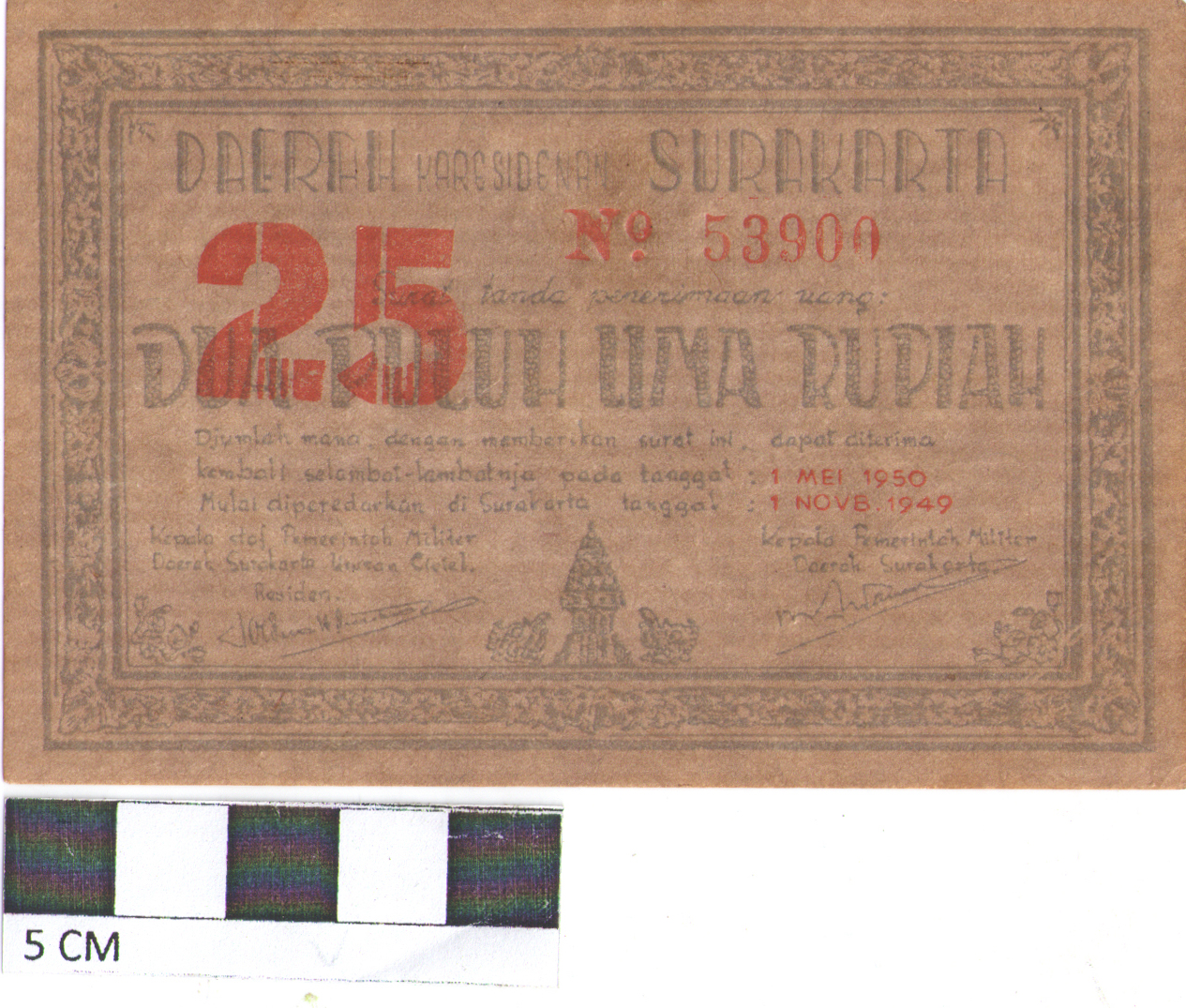 Mata uang ini terbuat dari bahan perak. Berbentuk bulat sisi depan terdapat tulisan NEDERL INDIE, dibagian tengah terdapat angka 1/4 Gulden dan gambar singa membawa tongkat diatasnya terdapat mahkota ( lambang Negara Belanda ), dibawahnya terdapat angka 1912. Disisi sebaliknya bertuliskan huruf Arab SEPER SDEPULUH RUPIAH sedang dikelilingi tulisan Jawa SEPRAPAT RUPIAH.