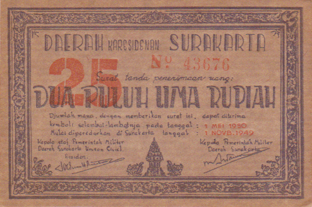Mata uang ini terbuat dari bahan perak. Berbentuk bulat sisi depan terdapat tulisan NEDERL INDIE, dibagian tengah terdapat angka 1/4 Gulden dan gambar singa membawa tongkat diatasnya terdapat mahkota ( lambang negara Belanda ). dibawahnya terdapat angka 1920. Disisi sebaliknya bertuliskan huruf Arab SEPER SEPULUH RUPIAH sedang dikelilingi tulisan Jawa SEPRAPAT RUPIAH.