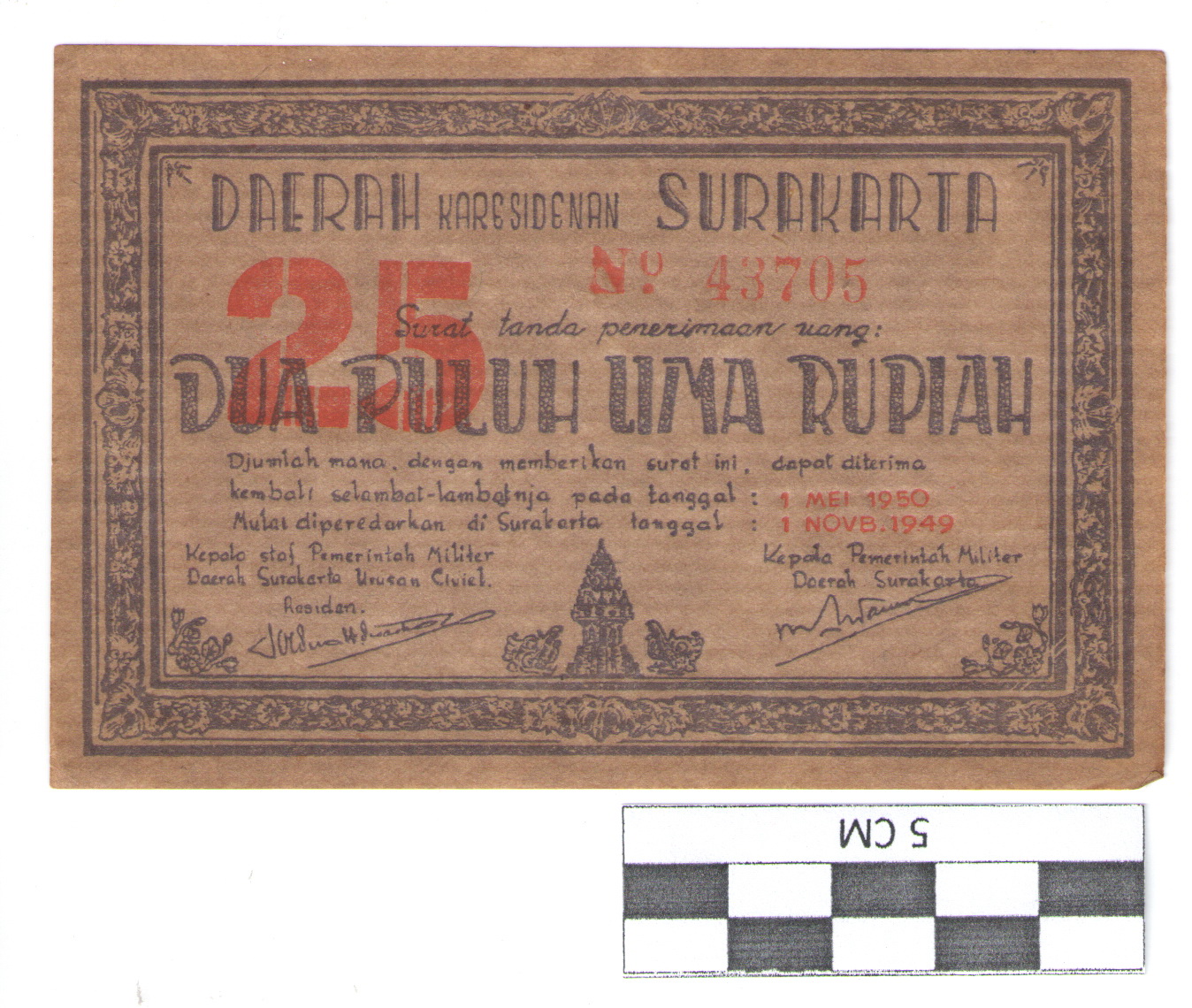 Mata uang ini terbuat dari bahan perak. Berbentuk bulat sisi depan terdapat tulisan NEDERL INDIE, dibagian tengah terdapat angka 1/4 Gulden dan gambar singa membawa tongkat diatasnya terdapat mahkota (lambang negara Belanda), dibawahnya terdapat angka 1921. Disisi sebaliknya bertuliskan huruf arab SEPER SEPULUH RUPIAH sedang di kelilingi tulisan jawa SEPRAPAT RUPIAH.