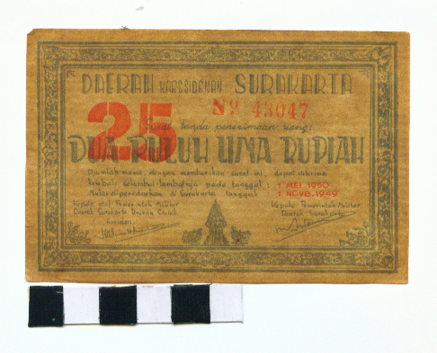 Mata uang ini terbuat dari bahan perak. Berbentuk bulat, sisi depan gambar mahkota kerajaan, dibagian atas bertuliskan NEDERL INDIE, disisi kiri tulisan 1/4, disisi kanan G dan dibagian bawah tahun 1920. Disisi sebaliknya bertuliskan huruf arab SUPER EMPAT RUPIAH yang dikelilingi huruf jawa.