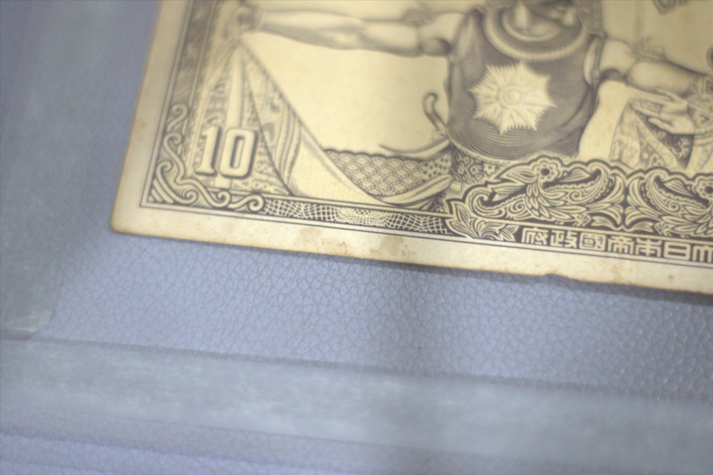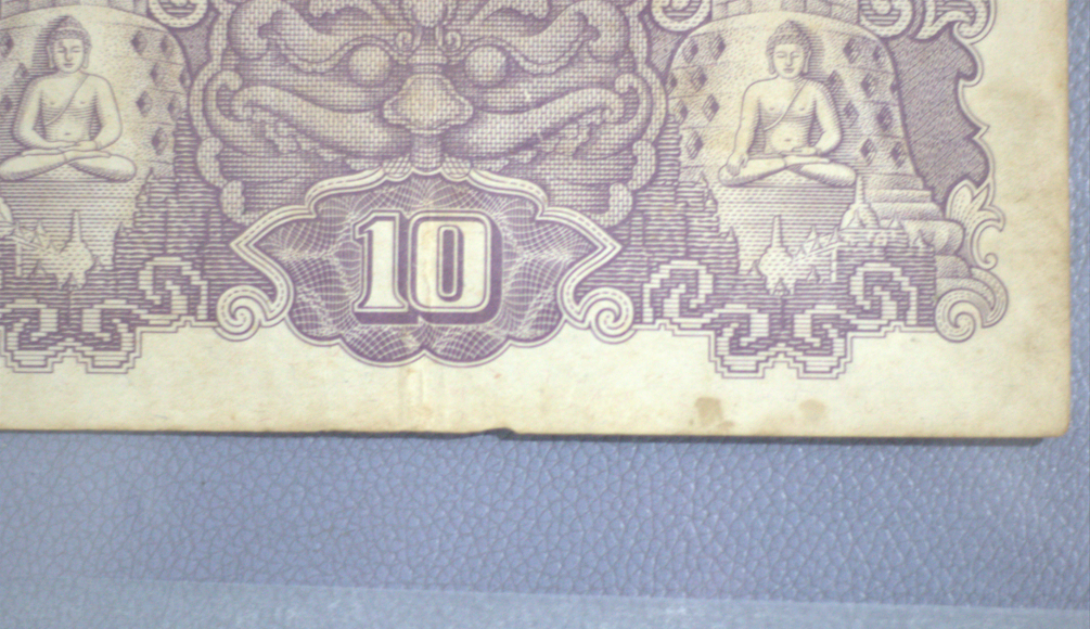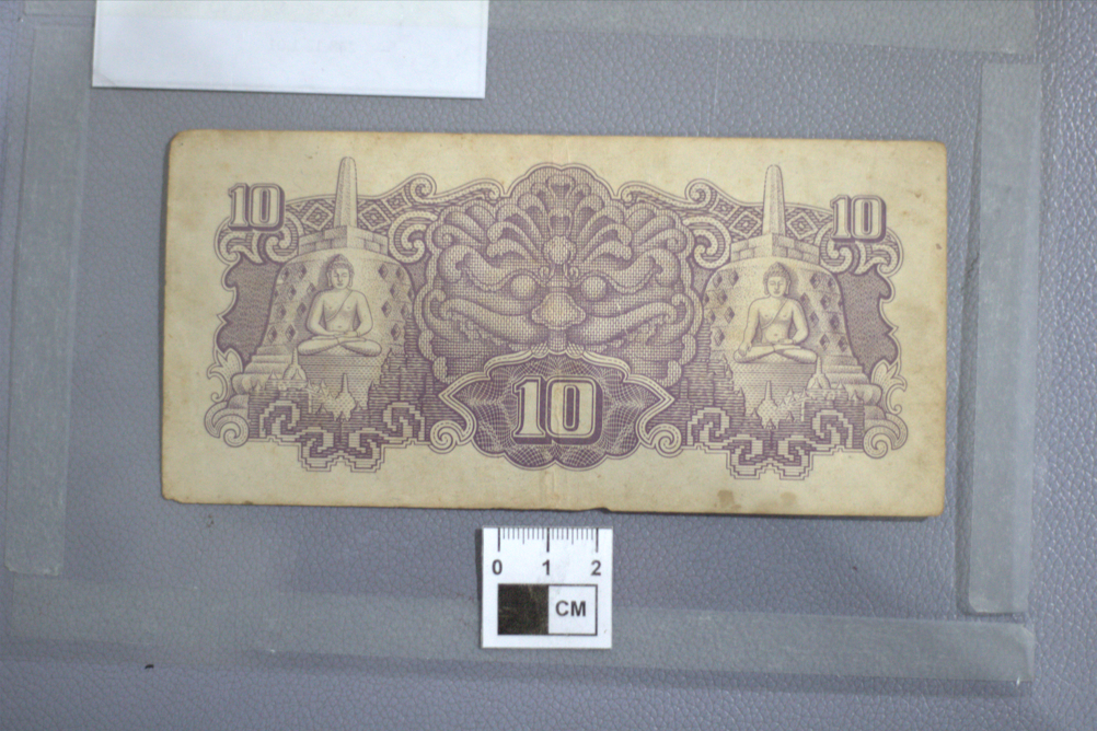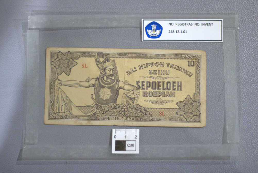 Uang dengan bahan kertas ini secara keseluruhan memiliki warna perpaduan putih, hitam dan ungu. Tampak depan uang memiliki beberapa gambar dan tulisan, di antaranya yaitu gambar seorang pria yang mengenakan kostum seperti gatot kaca yang sedang menari yang letaknya berada di sisi kiri, terdapat pula gambar bunga enam kelopak di dua sudut (kiri atas dan kanan bawah). Adapun di sisi kanan terdapat tulisan "Dai Nippon Teikoku Seihu" dan tulisan "SEPOELOEH ROEPIAH" dengan rupa huruf yang berbeda. Masih pada bagian depan terdapat angka 10 di dua sudut (kanan atas dan kiri bawah), dan dua tulisan "SL" berwarna merah di sisi kiri dan kanan. Selain itu, di bagian tepi seperti bingkai, memiliki motif abstrak yang unik. Kemudian terdapat tulisan berbahasa China di bagian bawahnya. Tampak belakang uang memiliki pola dan gambar berwarna ungu dengan dasar warna putih kekuningan. Motif bagian belakang uang di dua sisinya (kiri dan kanan) menggambarkan Candi Borobudur dengan patung Buddha di bagian depannya. Adapun di bagian tengah terdapat gambar berbentuk seperti topeng yang di bawahnya bertuliskan angka 10. Selain itu, angka 10 juga nampak dituliskan di dua sudut atas uang. Kondisi: Uang utuh dengan warna yang nampak kusam baik di bagian depan ataupun belakang. Terdapat noda di beberapa titik dan di tepi bagian bawah nampak tidak rata.
