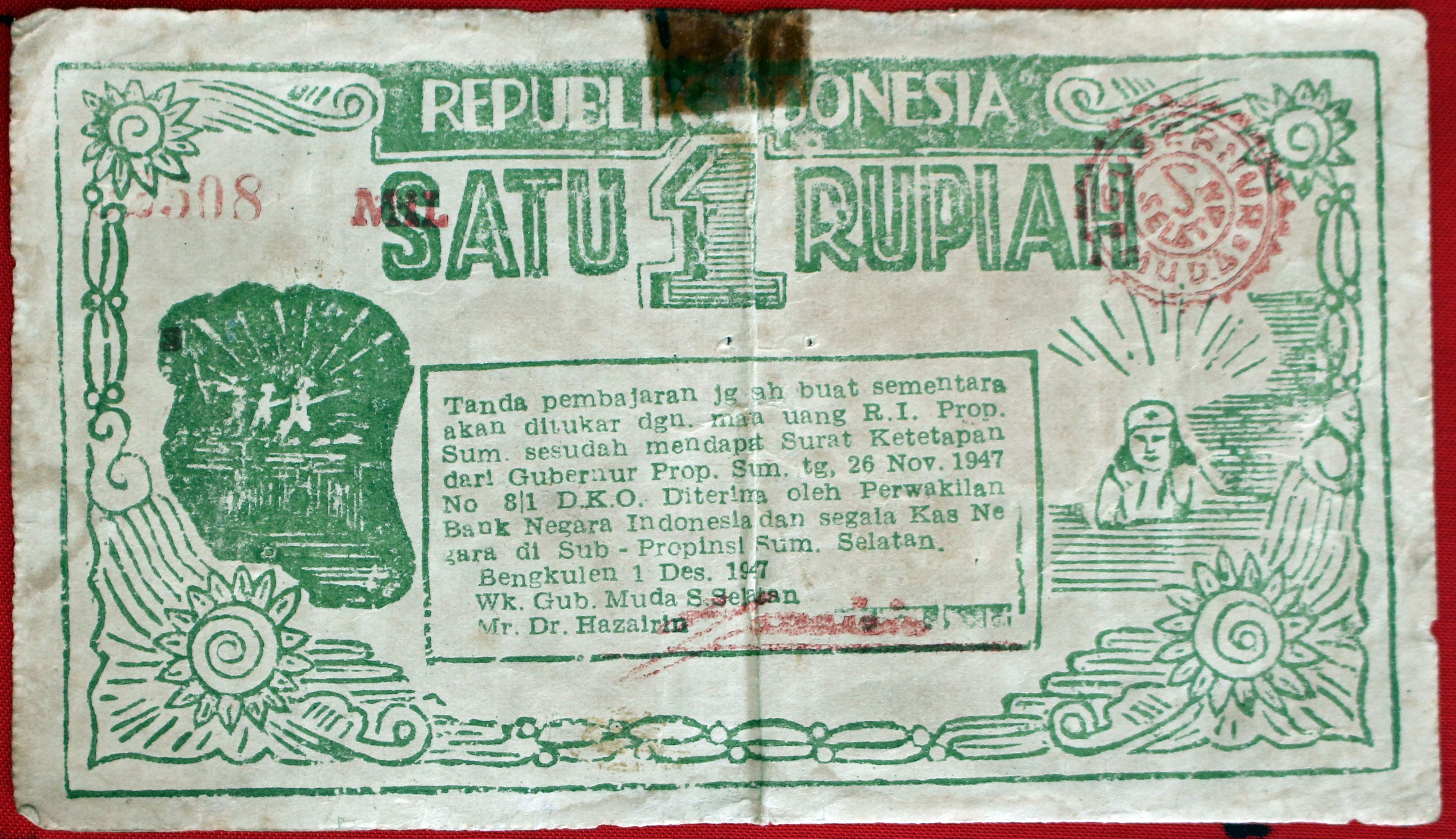 terbuat dari bahan kertas, sisi muka harga dan nama otoritas, sisi belakang terdapat angka 1, percetakan Djakarta Insatsu Kodja No.Seri s/Du. Sumber acuan katalog uang kertas Indonesia 1782-1996, penerbit Yayasan Tridaya Warga Kejaksaan R.I 1996