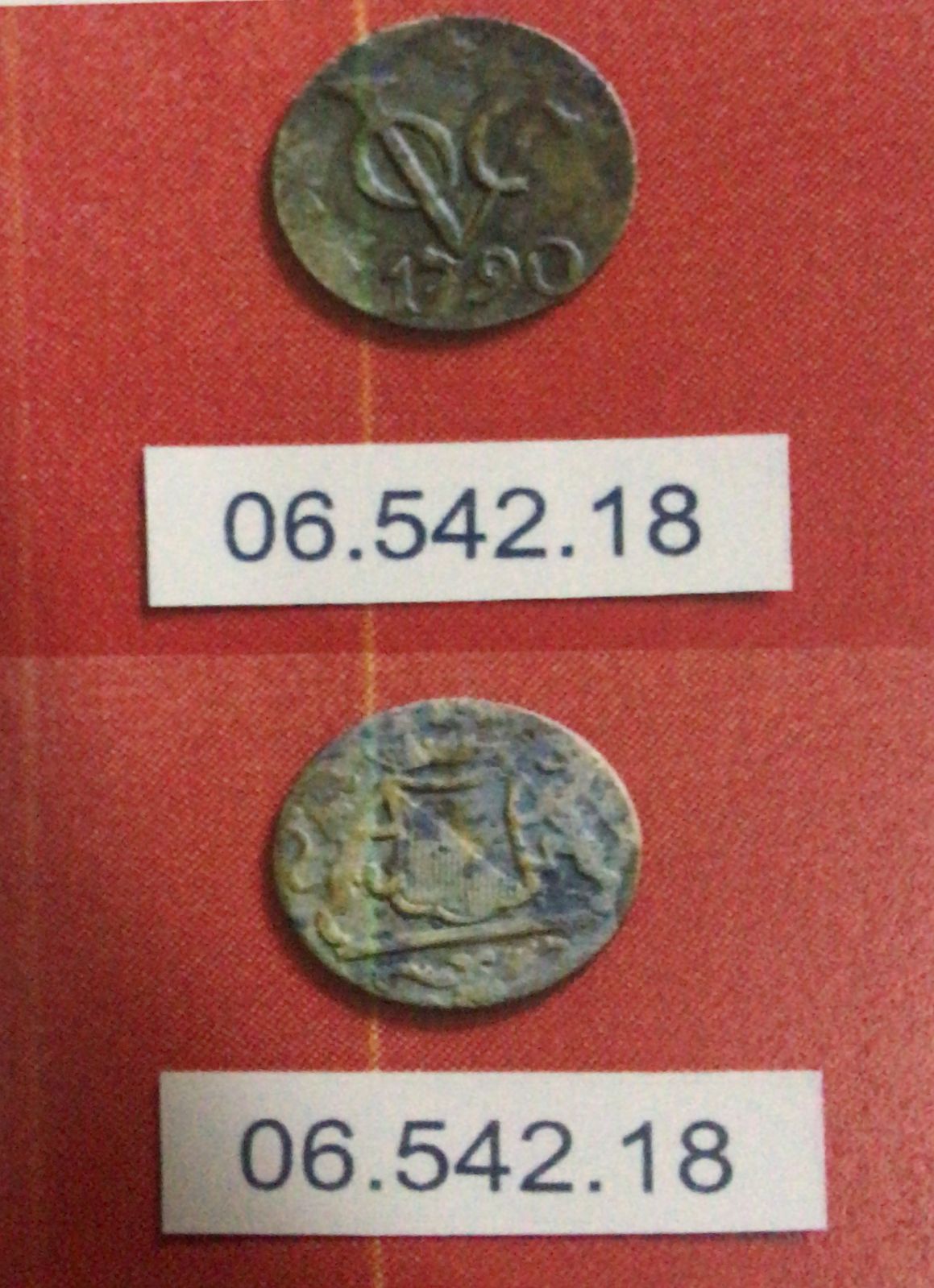 Mata uang VOC tahun 1790. Bagian depan terdapat lambang VOC, diatasnya terdapat bintang berjumlah 1. Disisi sebaliknya terdapat mahkota ( lambang negara Belanda ). Mata uang ini terbuat dari bahan tembaga, secara umum permukaan aus dan susah untuk dibaca. Pada saat itu , mata uang ini disebut sebagai Duit. Duit adalah sebutan bagi alat transaksi kecil yang berfungsi seperti uang, yang dibuat pada abad ke-17.