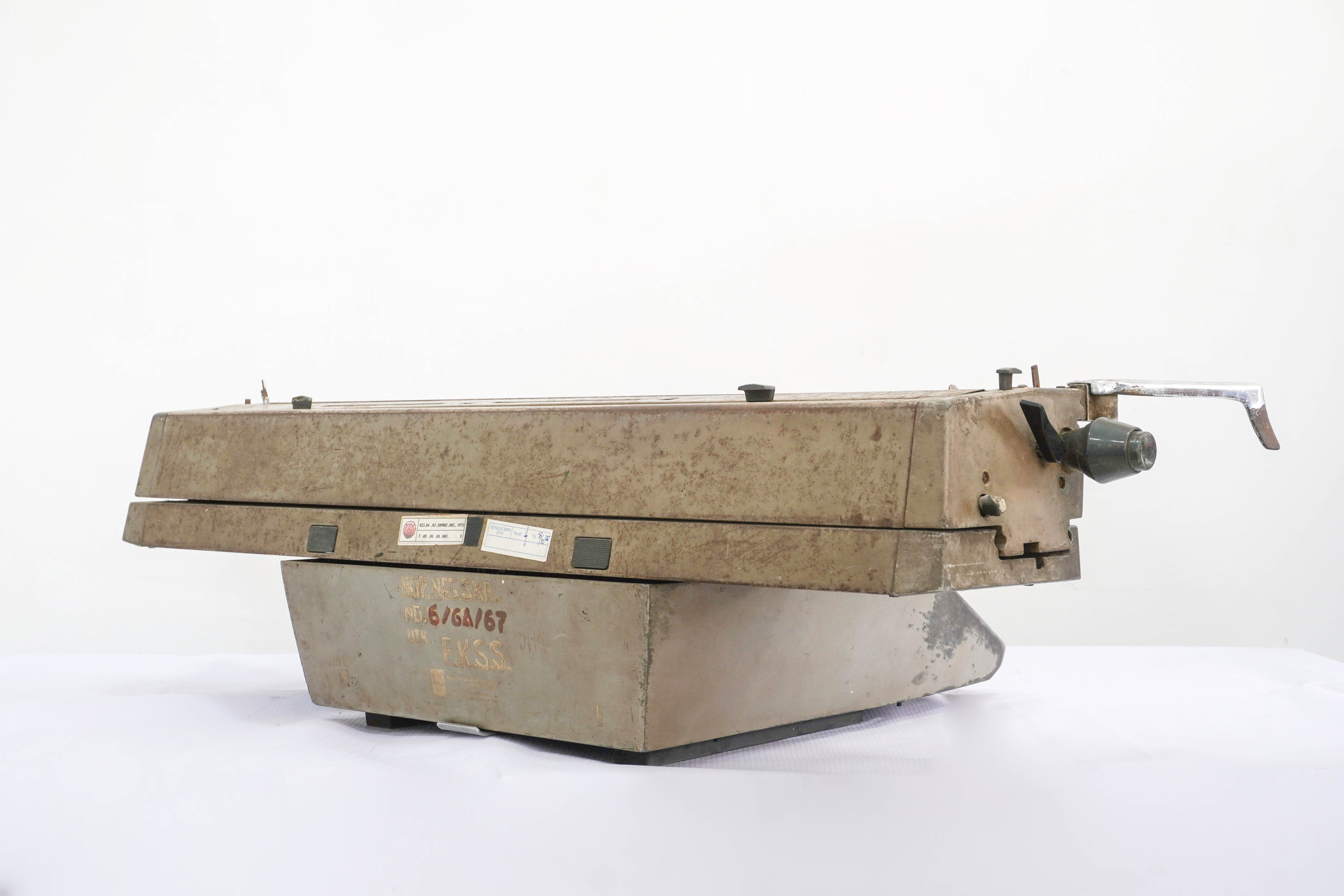 Mesin ketik manual dengan desain klasik. Bagian papan ketik terdiri dari deretan tombol berwarna abu-abu tua, sementara tuas penggeser kertas dan silinder rol kertas terlihat cukup panjang, menandakan tipe mesin ketik ukuran besar. Komponen logam pada mesin menunjukkan tanda-tanda keausan dan karat, menandakan usia pemakaian yang cukup lama. Mesin ketik ini berfungsi untuk menulis dokumen secara mekanis sebelum era komputer.