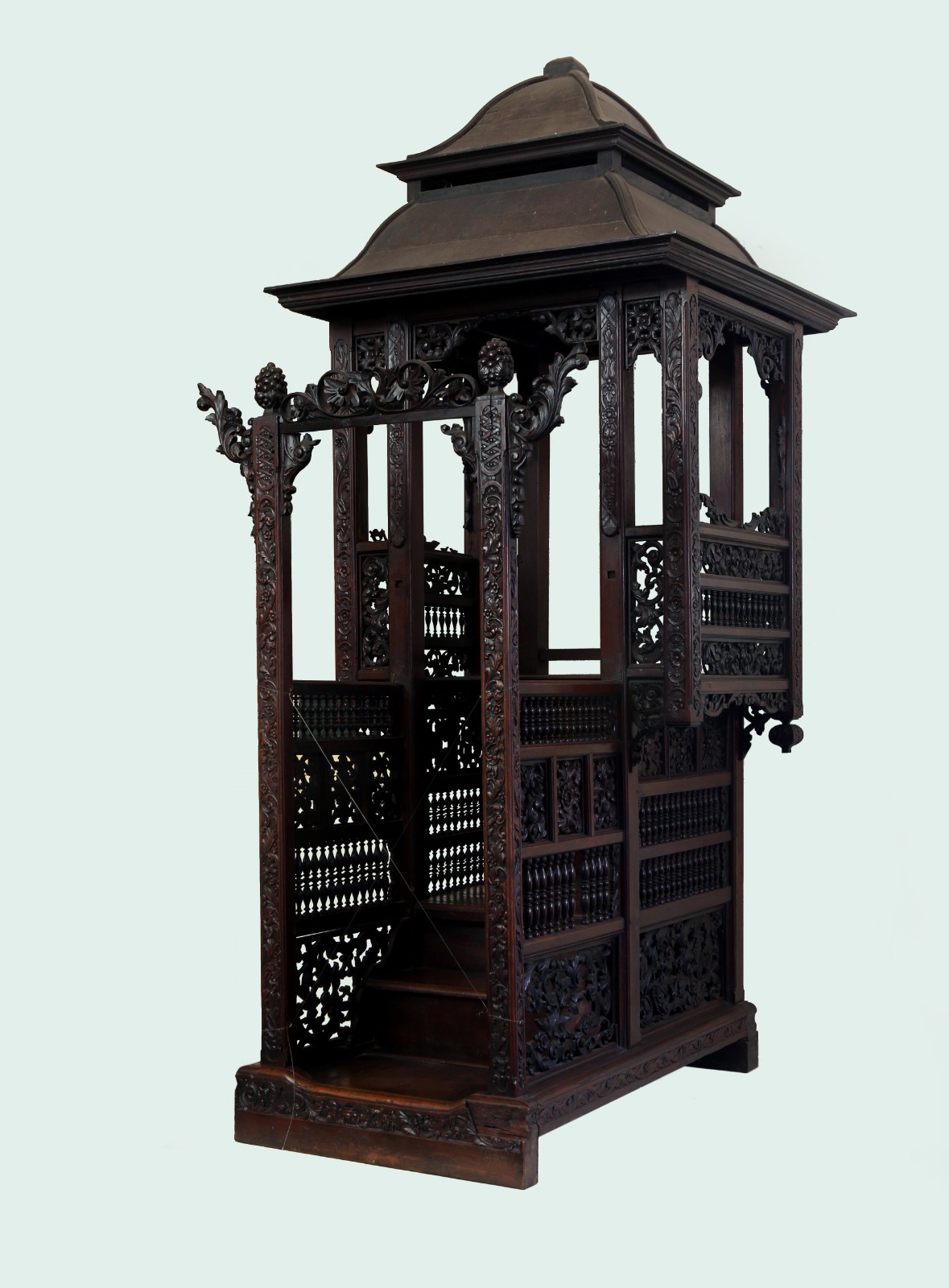 Mimbar tersimpan di dalam ruang 1A05 (Ruang Sultan Agung) Museum Sejarah Jakarta. Koleksi yang terbuat dari bahan kayu jati dan berwarna coklat ini memiliki tinggi keseluruhan kurang lebih 335 cm, panjang 94 cm, dan lebar 165,5 cm. Mimbar memiliki empat sisi, yaitu depan, belakang, dan samping kanan kiri. Jika dilihat dari belakang, mimbar memiliki sebuah bingkai berbentuk persegi panjang yang berfungsi sebagai "pintu masuk" ke bagian dalam. Bingkai ini dihias relief sulur dan buah-buahan pada bagian sisi kanan dan kiri. Sementara di sisi atas tampak dihias relief tembus berbentuk sulur dan buah menyerupai anggur. Masih dari bagian belakang mimbar, tampak kaki mimbar berbentuk persegi panjang yang tepiannya dihias relief sulur. Di atasnya terdapat dua buah undakan yang sekaligus bisa digunakan sebagai tempat berdiri. Undakan bawah memiliki panjang 67 cm, lebar 91 cm dan tinggi 22 cm. Sedangkan undakan atas memiliki ukuran panjang 67 cm, lebar 33 cm dan tinggi 22 cm. Di atas undakan kedua, terdapat papan kayu yang berbentuk seperti meja. Atap mimbar berbentuk atap tumpang dua susun. Dilihat dari bagian kanan dan kiri, mimbar dipenuhi relief tembus pada bagian kaki, hiasan tiang kecil-kecil di bagian badan, dan relief tembus dengan pola sulur pada bagian atas. Mimbar tampak seperti memiliki jendela pada sisi kanan dan kiri. Saat ini, kondisi mimbar rusak ringan dengan beberapa bagian dekorasi tiang yang hilang/lepas, cat yang mengelupas, bagian relief tembus yang patah, hingga terdapat bekas coretan dan bercak cat putih di undakan atas.