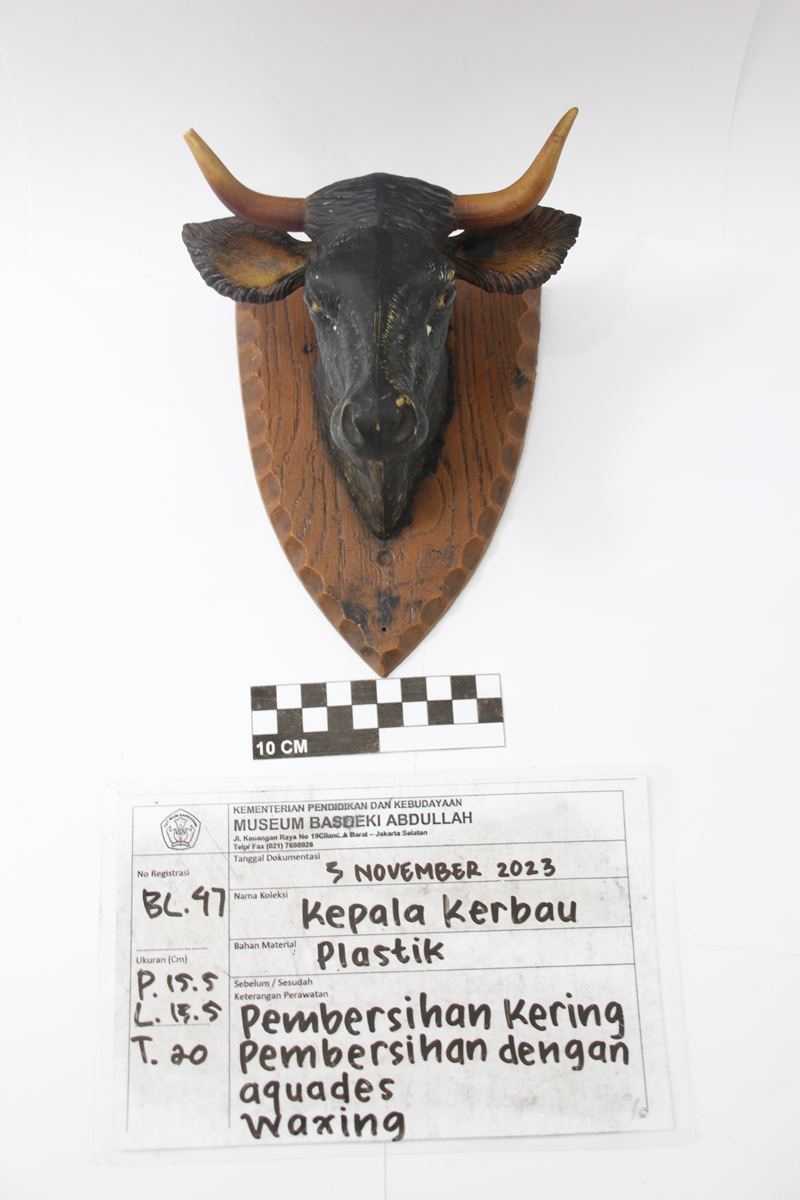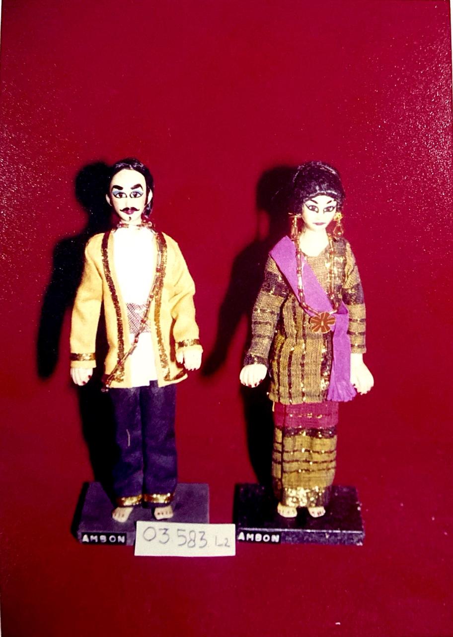 Boneka terbuat dari fiber. Mengenakan setelan kain tenun warna kuning kehijauan prodo emas, baju model blong kain sarung ditutup dengan kain tenun warna merah prodo emas, pemakaiannya didalam baju dilengkapi kain selempang warna merah jambu, memakai sanggul, hiasan anting dan kalung. Tanpa alas kaki.