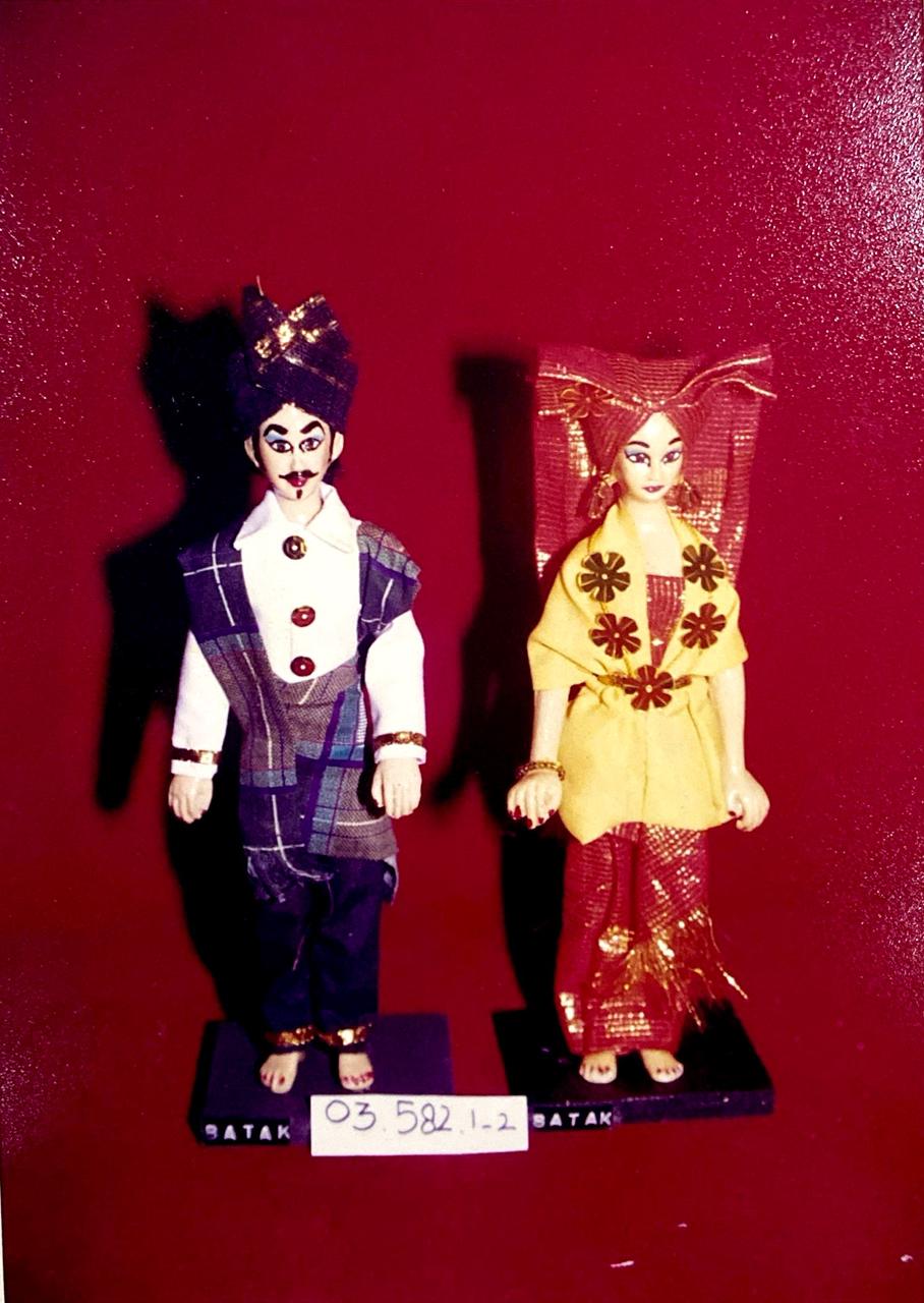 Boneka terbuat dari fiber. Mengenakan kain tenun ulos suji sampai batas dada warna merah ditutupi dengan warna kuning. Dilengkapi ikat pinggang dan hiasan payet ceplok bunga berjumlah 5, kepala tertutup dengan kain ulos warna merah model Minangkabau, dengan hiasan anting dan gelang, tanpa alas kaki.