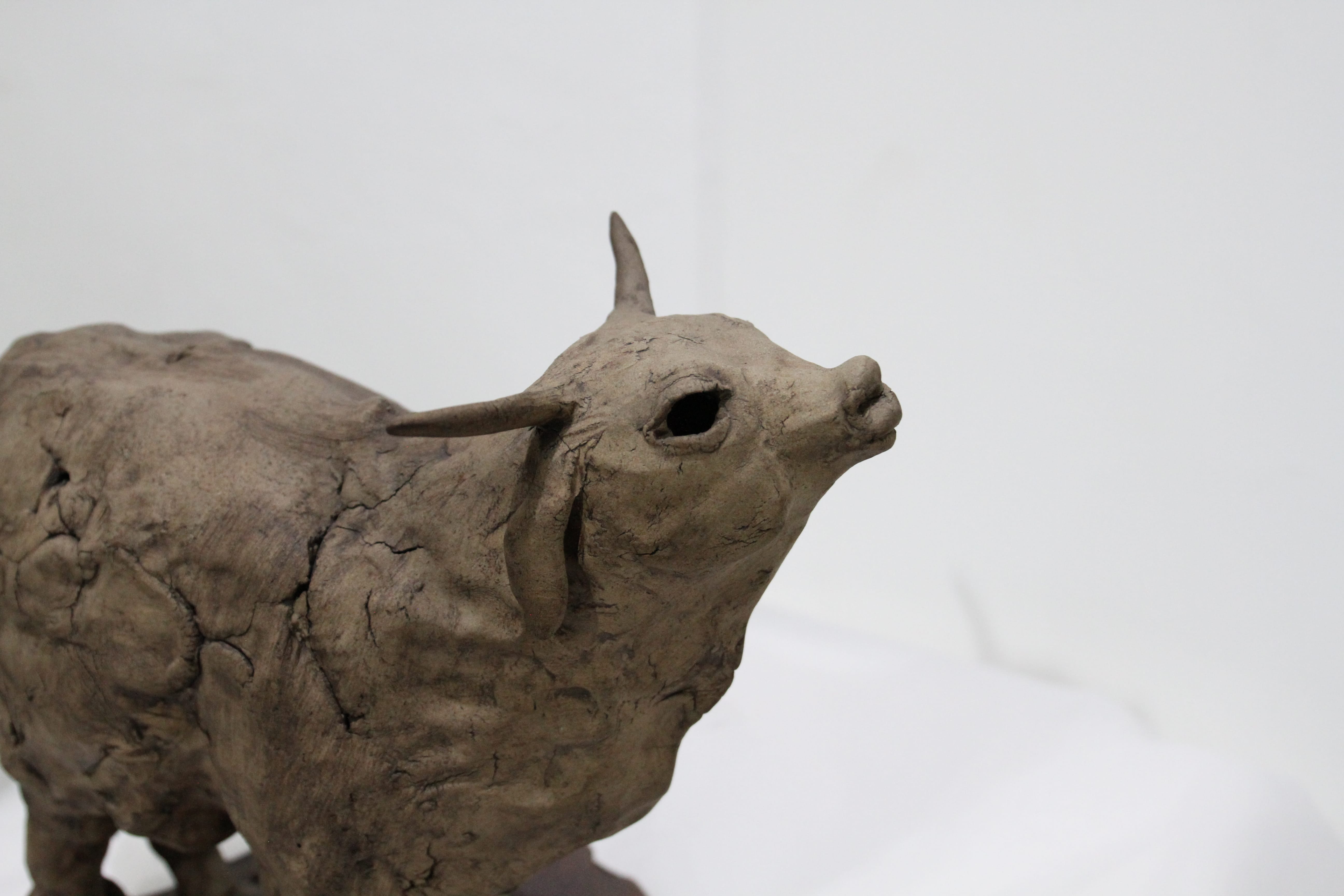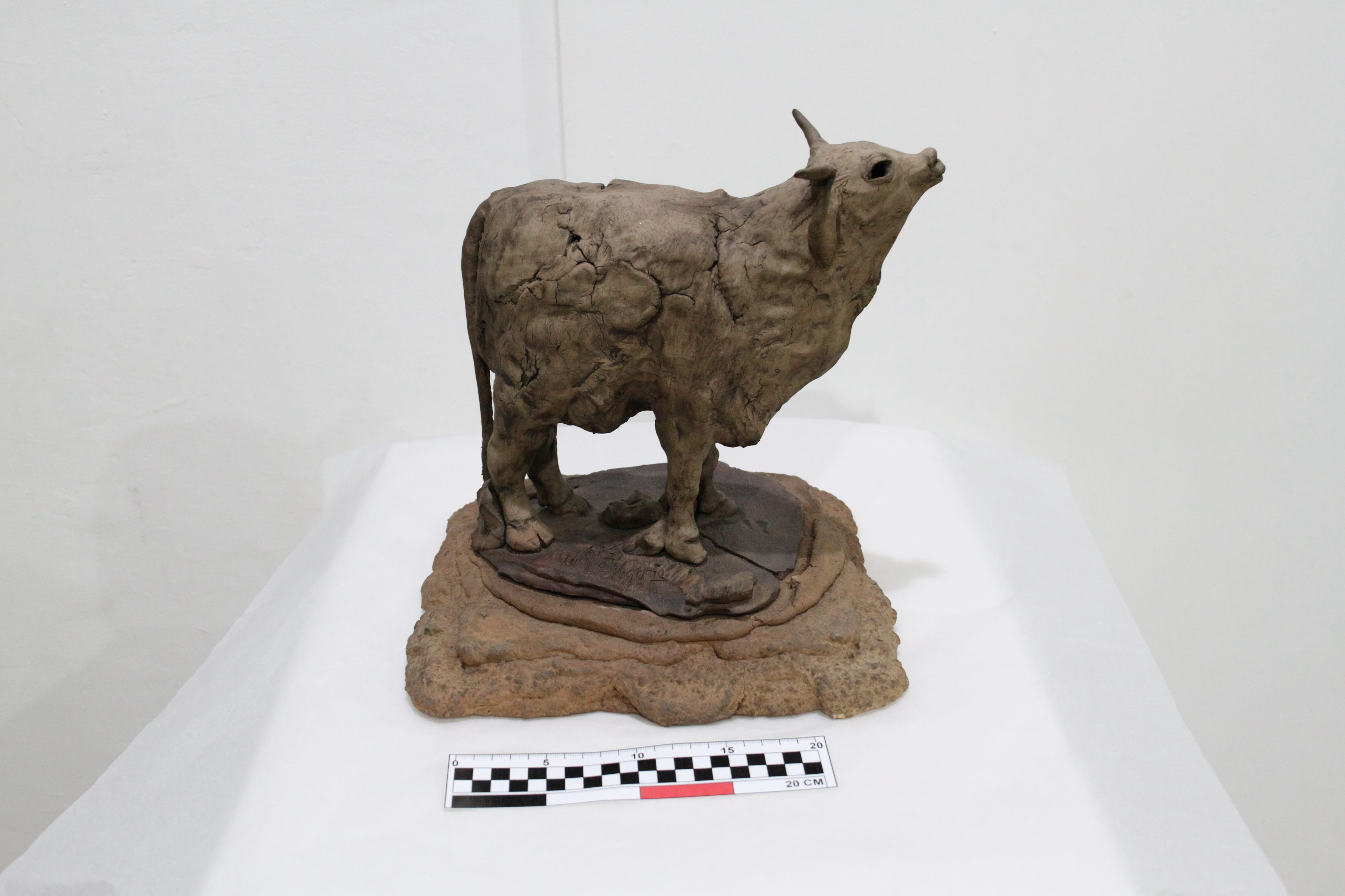 Liem Keng Sien Minta Perhatian Tanah liat yang dibakar 33 x 31,2 x 31,9 cm Keramik terdiri dari dua bagian yaitu berbentuk bagian alas dan bagian sapi. Terdapat tanda tangan dan tanggal (21/03/1997) pada bagian bawah sapi. Bagian badan sapi tidak halus, sehingga terdapat lobang dan garis-garis. Pada bagian bawah sapi, terdapat empat pola lubang di dekat kaki kiri belakang dan terdapat 5 gumpalan tanah liat. Kepala sapi sedikit mendongak ke atas dengan mata yang bolong. Bagian dasar karya bertingkat. Alas berbentuk persegi dan bagian atasnya berbentuk lingkaran tidak sempurna. Pada bagian atas alas terdapat bentuk menyerupai daun teratai yang berwarna hitam dan dibatasi garis putih. Sedangkan, bagian dasar alas berwarna hitam. Keramik ini dibuat menggunakan teknik Pienching. Detail Ukuran: Ukuran bagian bawah. Lebar : 31.2 cm, Panjang : 30.2cm, dan Tinggi : 4.6cm. Ukuran bagian atas. Lebar : 29.5cm, Panjang : 21.1cm, Tinggi : 28cm. Biodata Seniman: Liem Keng Sien merupakan seorang seniman keramik kontemporer asal DKI Jakarta. Ia lahir pada tanggal 20 Desember 1954 di Jakarta dan meninggal pada 21 Maret 2014 di usia 59 tahun. Pada tahun 1982, ia menjalani pendidikan formal di Akademi Keramik Kota Leuven, Belgia. Ia kemudian kembali ke Indonesia dan berkarya di studio keramik yang terletak di Cawang dan di Desa Sepayang Jaya, Bekasi Barat pada tahun 1984 hingga 1989. Ia kemudian mendirikan galeri Appelsien di kawasan Menteng, Jakarta Pusat. Liem Keng Sien menjadi guru bagi banyak keramikus di Indonesia. Karya dongengnya yang digambarkan kedalam seni keramik, tanah liat, mineral, pewarna dan tekstual menjadikan cirikhasnya.