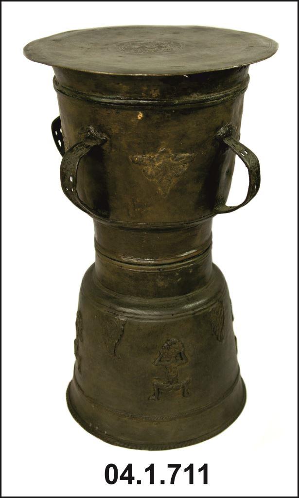 Warna coklat kehitaman, bertutup, terdapat pegangan 4 buah dan hiasan manusia, flora, bagian bawah tangkai lebih kecil dan terdapat sambungan, bagian bawah terdapat hiasan flora dan manusia. Fungsi : sebagai pelengkap upacara. Guna : untuk dibunyikan sebagai alat pemanggil. Teknik pembuatan : cetak, cor. Teknik pengamantan : matrik.