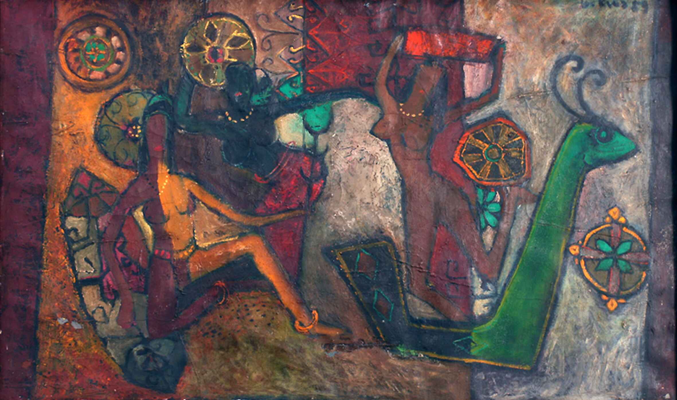 Karya seni ini menampilkan komposisi abstrak yang dinamis. Dominasi warna-warna gelap seperti cokelat tua, hitam, dan sedikit sentuhan warna terang seperti putih atau kuning. Garis-garis tegas dan goresan kuas yang tebal membentuk pola-pola yang saling tumpang tindih. Beberapa bagian terlihat seperti bentuk-bentuk organik yang samar-samar, seperti pepohonan atau bangunan. Terdapat pula area-area dengan tekstur yang kasar, seolah-olah permukaan kanvas memiliki relief tertentu. Latar belakang karya ini berwarna lebih terang, memberikan kontras dengan bagian depan yang lebih gelap.