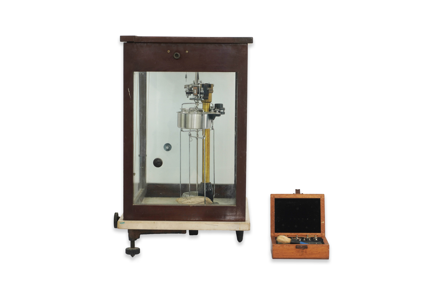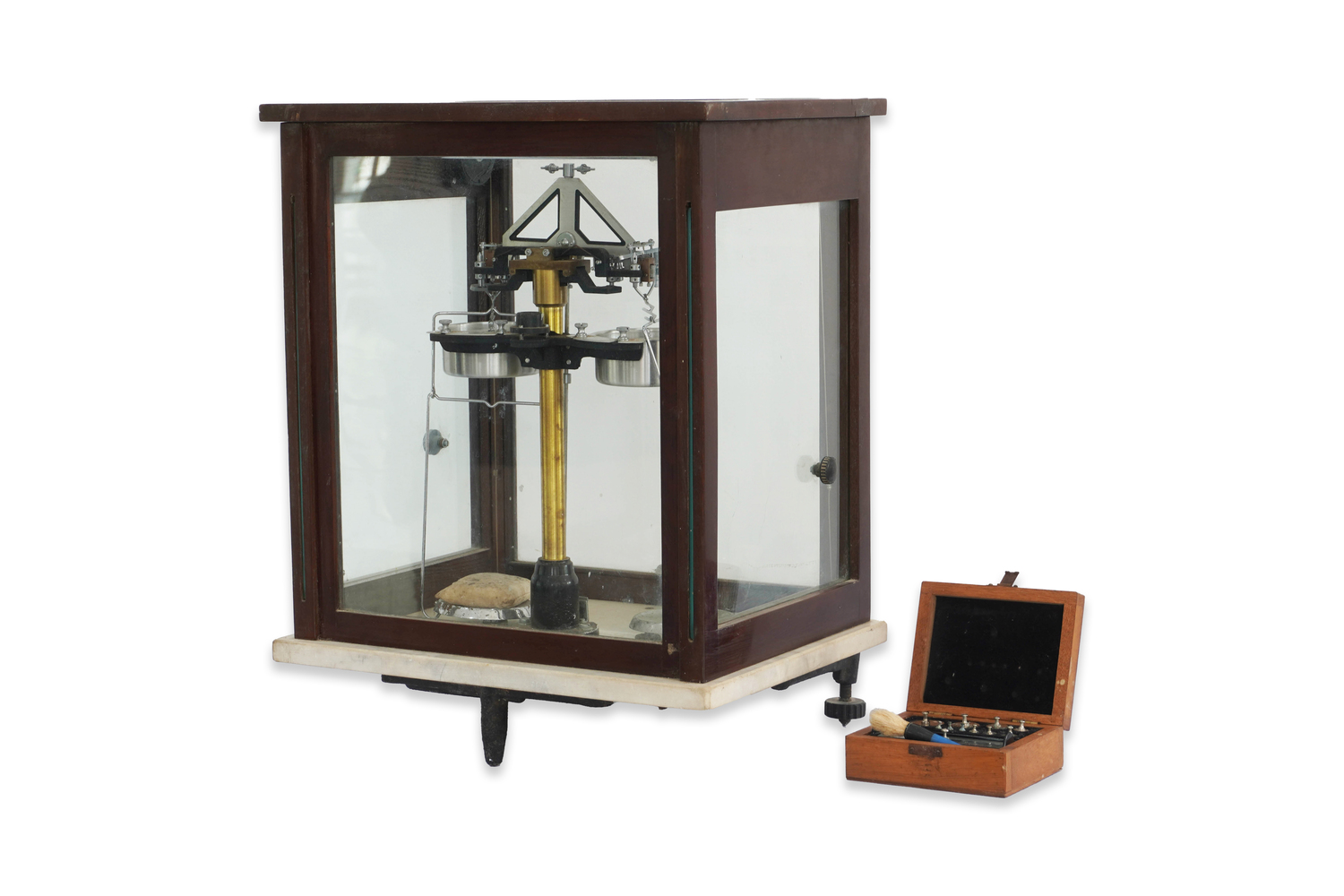 Foto ini menampilkan sebuah timbangan obat model klasik dengan dua lengan (neraca). Timbangan ini ditempatkan dalam kotak kaca dengan rangka kayu agar terlindung dari debu dan angin sehingga hasil penimbangan lebih akurat. Di sampingnya terdapat kotak kayu kecil berisi anak timbangan logam dengan berbagai ukuran, serta sebuah kuas kecil untuk membersihkan. Timbangan obat seperti ini dahulu digunakan di apotek atau laboratorium untuk menimbang bahan kimia maupun obat dengan presisi tinggi.