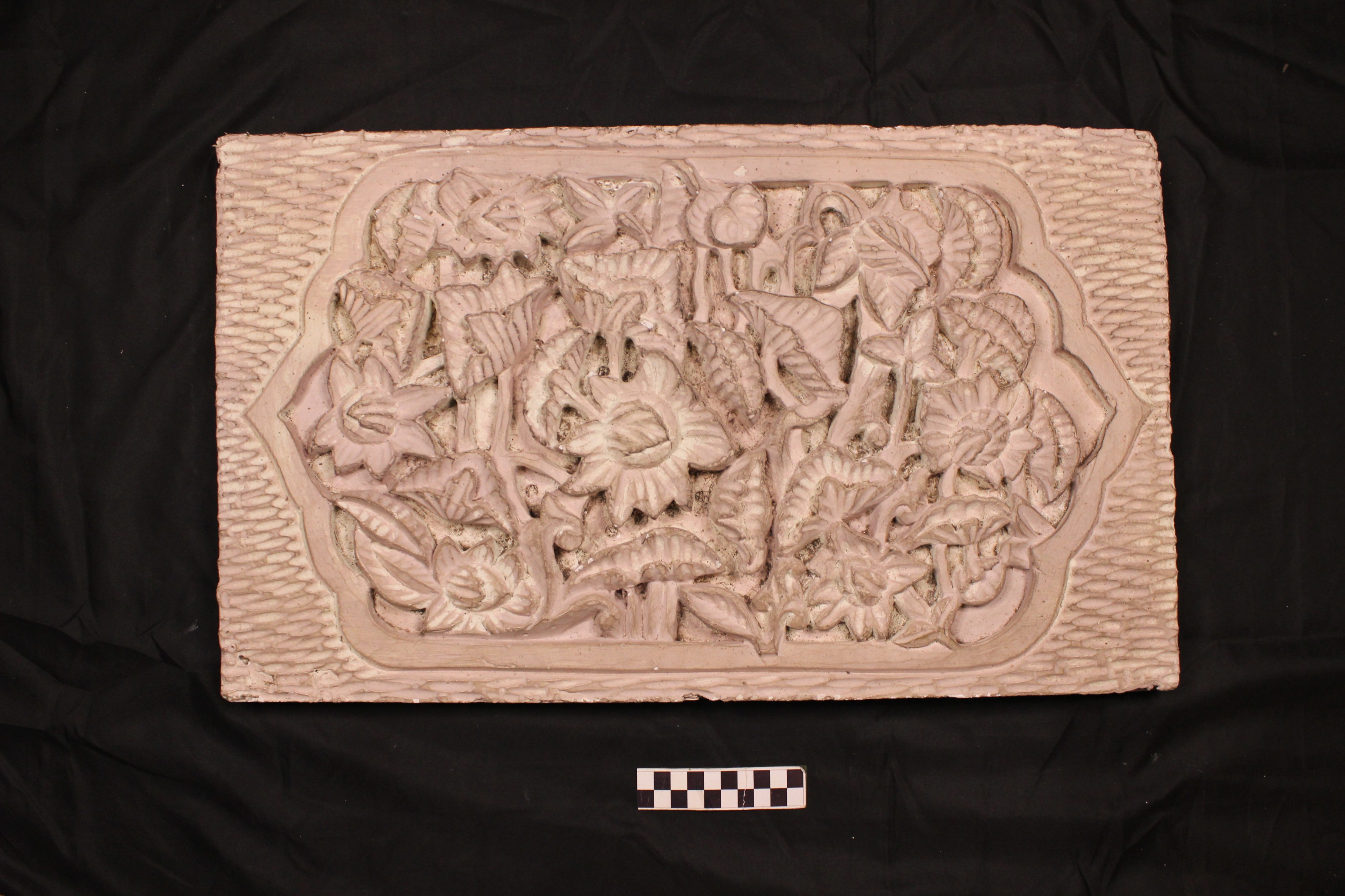 Objek berbentuk persegi panjang didalamnya terdapat ornamen terbuat dari batu putih dengan hiasan berupa flora pada permukaannya. Objek berfungsi sebagai hiasan.
