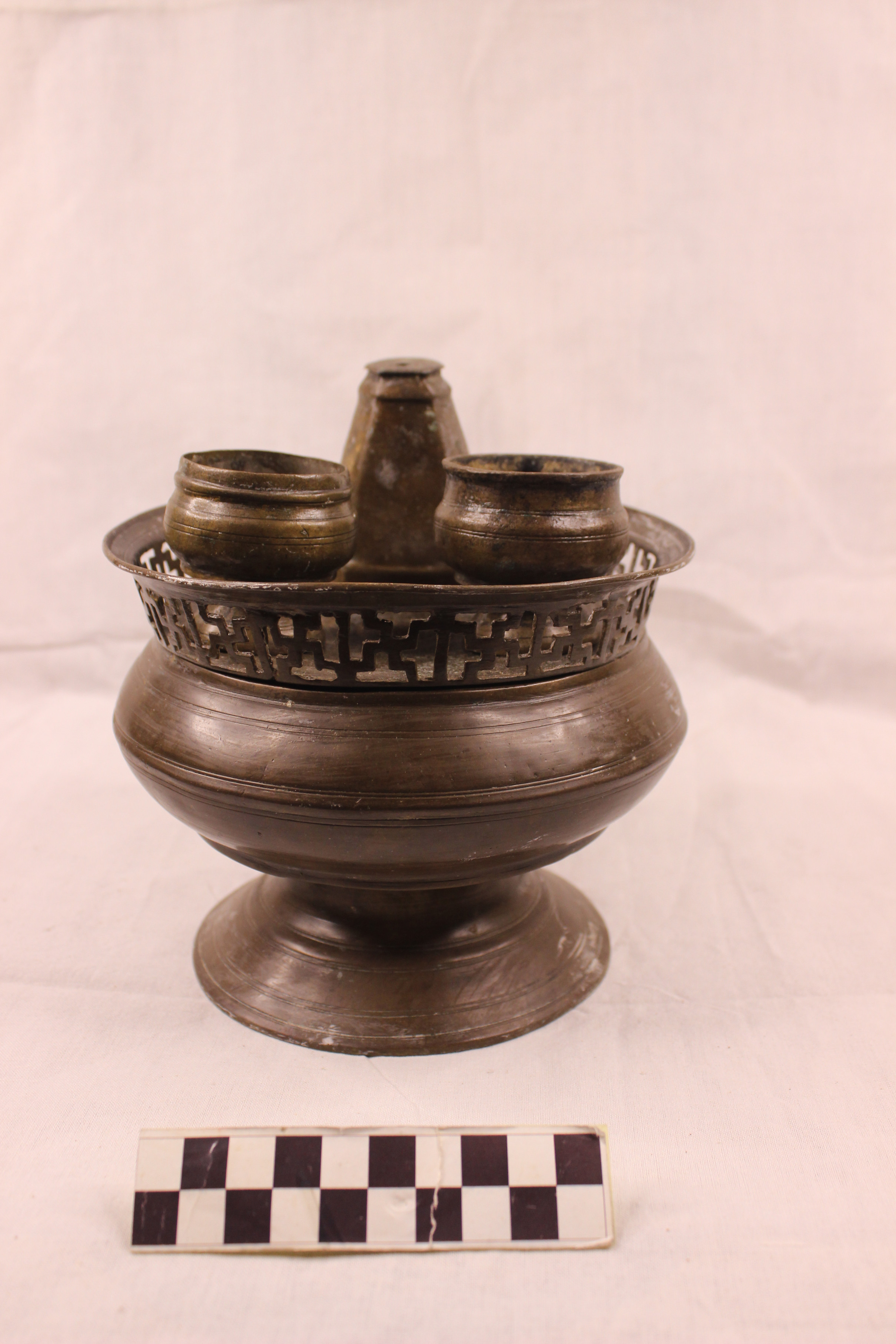 Wadah yang digunakan untuk perangkat menyirih. Objek ini terdiri dari beberapa bagian untuk meletakkan bahan- bahan pakinangan seperti daun sirih dan injit