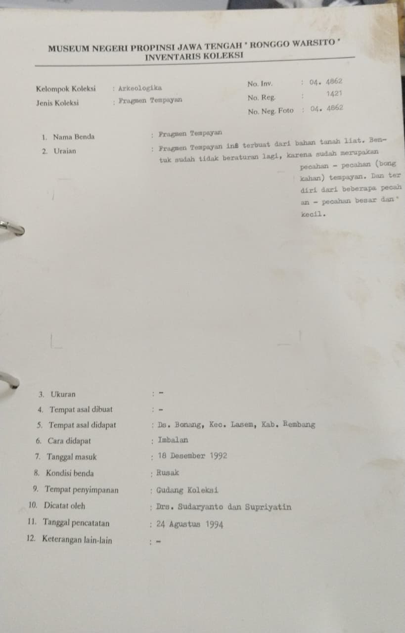Bentuk badan bulat, leher tinggi dan melebar ke atas. Mulut lebar membalik keluar (seperti kelopak bunga). Sisi bibir bentuk segitiga sebanyak 18 (delapan belas) buah. Antara sisi bibir dan badan terdapat tangkai bulat melengkung, gunanya sebagai tangkai pegangan untuk mengangkat benda. Ujung bawah leher terdapat relief berupa garis lingkaran. Pada bagian atas badan terdapat 2 (dua) buah garis lingkaran. Pada bagian tengah badan terdapat relief lingkaran. Terdapat pinggang dan kaki bulat melebar ke bawah. Di atas sisi kaki terdapat garis lingkaran. Dasar tengah kaki berongga. Paludahan/tempolong merupakan wadah/tempat untuk membuang sepah (kucuran) sesudah makan sirih.