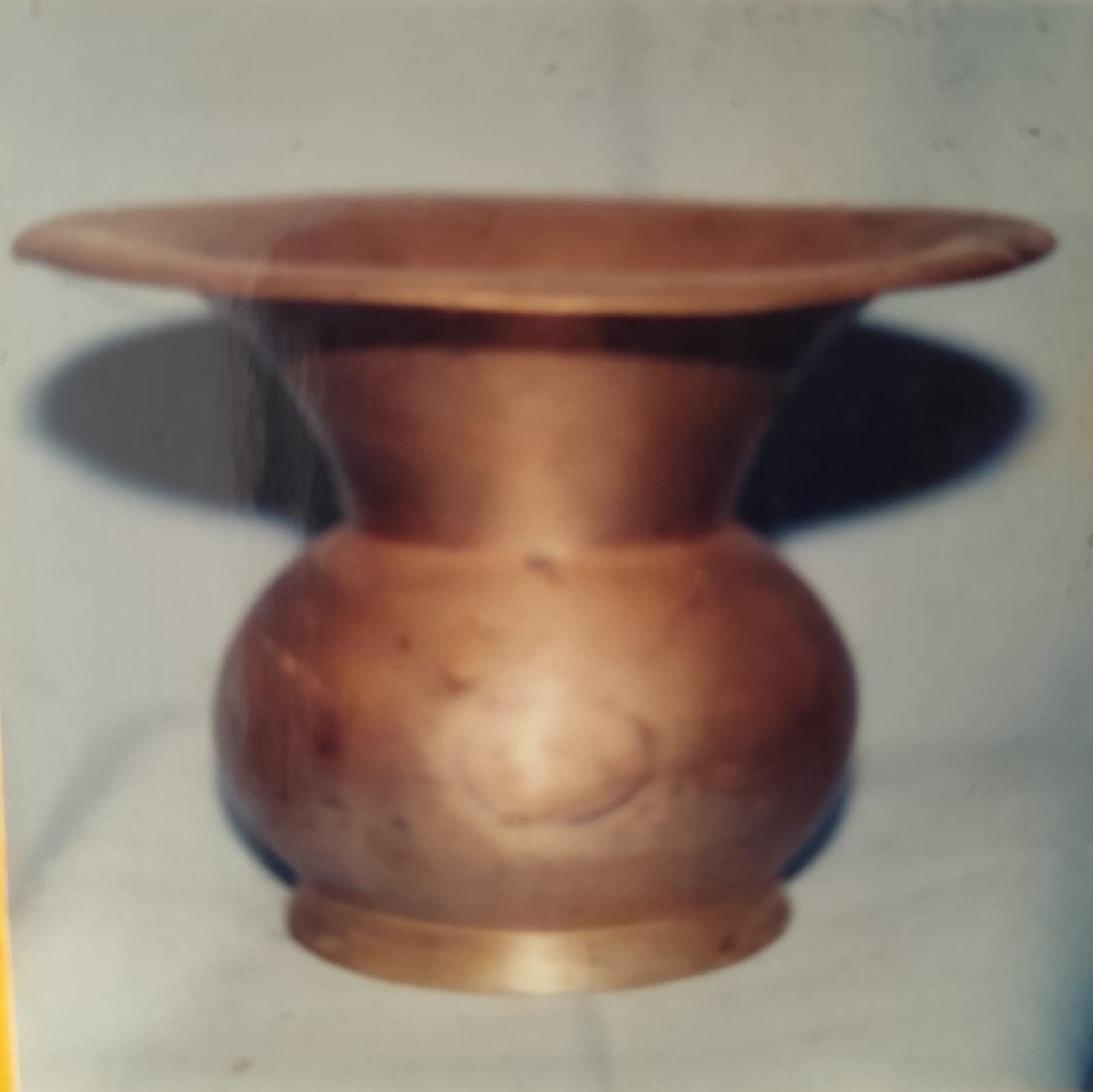 Bahan terbuat dari kuningan dengan warna kuning. Benda ini berbentuk bulat tinggi dengan mulut bundar membuka lebar keluar, leher tinggi, bagian badan bulat gemuk. Bagian bawah merupakan kaki bundar melebar. Benda ini di Kalimantan Tengah merupakan peralatan menginang yang digunakan sebagai wadah tempat menampung air ludah maupun sampah-sampah sisa menginang.
