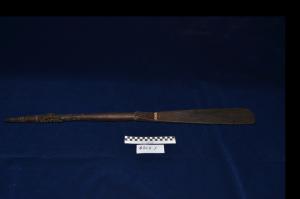 Terbuat dari kayu belian warna hitam, dipahat berbentuk antropomorf (menyerupai manusia), berkelamin laki-laki. Posisi berdiri di atas balok kayu segi empat yang diukir motif manusia pada keempat sisinya. Kedua tangan menempel pada dada sambil memegang lidahnya yang menjulur keluar. Muka kecil, hidung pesek, mata cekung, telinga tegak, kepala memakai peci bentuk bulat.