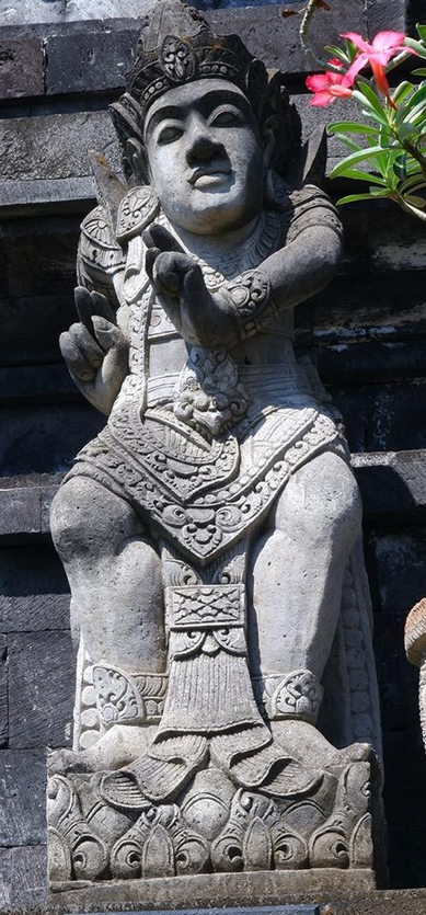 Patung menempati sisi utara bangunan, tepatnya pada Kori Agung 2. Patung dibuat dengan material batu padas Bali warna natural unpolished, dengan dimensi panjang 50 centimeter, lebar 50 centimeter dan tinggi 190 centimeter. Gaya rupa patung menggunakan gaya seni Bali kontemporer dengan teknik pahat. Patung