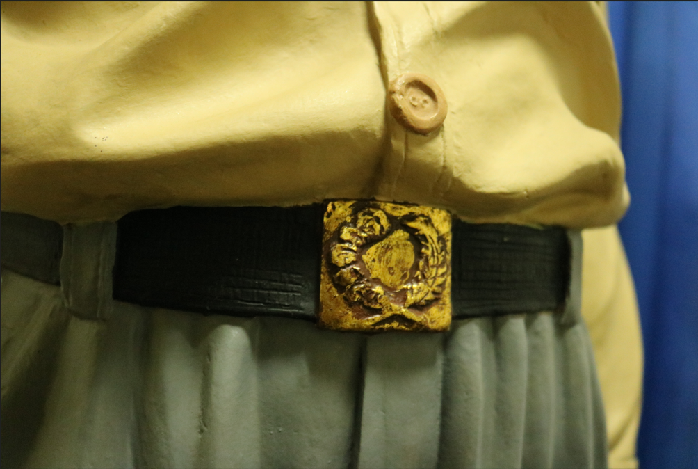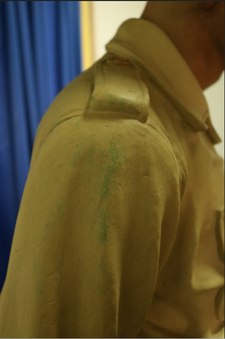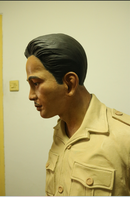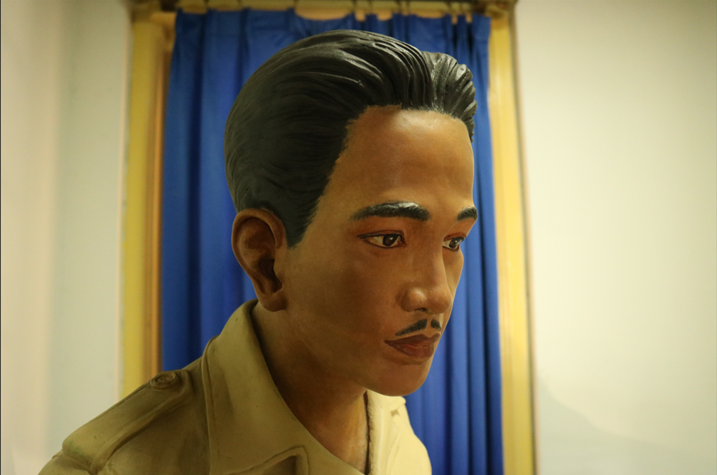 Patung merupakan replika dari tokoh bersejarah B.M. Diah. Patung ini terletak di ruang pengetikan naskah proklamasi dan berdiri di samping patung Sayuti Melik yang sedang mengetik. Patung B.M Diah mengenakan baju kemeja panjang berwarna putih tulang agak ke kuningan dan celana panjang warna abu-abu tua dilengkapi dengan gesper warna hitam dan kepala gesper bermotif padi dan kapas warna emas. Patung B.M Diah mengenakan sepatu pantofel warna cokelat tua. Posisi dari patung ini menghadap ke arah barat laut dengan posisi berdiri dan tangan kanan dimasukkan ke dalam saku. Kondisi dari patung ini cukup bagus. Pada bagian baju, tepatnya lengan kanan, terdapat noda cat berwarna hijau. Terdapat juga noda-noda berwarna hitam di permukaan patung.