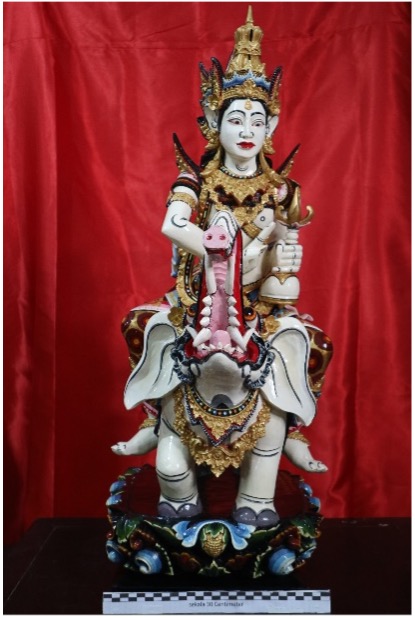 sebuah patung dewa iswara memakai gelungan, petitis ,megunakan badong,gelang kana, yang semuanya berlapis emas. Dewa Iswara bersenjatan bajra dengan menunggangi se- ekor gajah berwarna putih yang juga berhiaskan badong berlapiskan emas dan berpelana kain bermotif ukiran Bali.