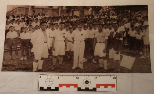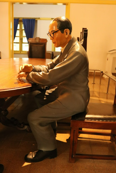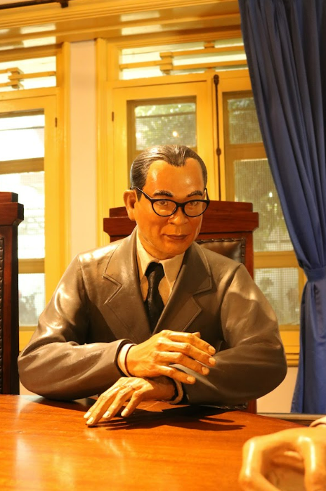 Patung duduk replika Moh. Hatta ketika perumusan naskah proklamasi. Patung Moh. Hatta duduk menghadap barat. Patung duduk Moh. Hatta mengenakan sepatu hitam, setelan jas berwarna abu-abu, kemeja putih, dasi berwarna hitam, dan kacamata yang dapat dilepas pasang. Patung Moh. Hatta melipat tangan di atas meja, dan berada di sebelah kanan patung Ir. Soekarno. Kondisi patung cukup baik, tetapi ada beberapa noda putih, sedikit gumpil, dan bekas lem di bagian tangan patung yang diduga bekas restorasi bagian patah.