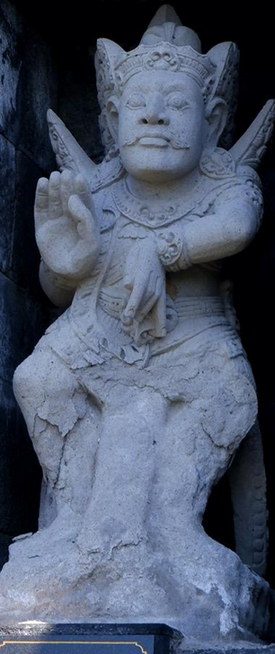 Patung menempati sisi timur bangunan, tepatnya pada Kori Agung 1. Patung dibuat dengan material batu padas Bali warna natural unpolished, dengan dimensi panjang 40 centimeter, lebar 40 centimeter dan tinggi 120 centimeter. Patung ditempatkan secara built-in pada titik penempatan yang telah dibuatkan lubang dalam struktur arsitektur. Gaya rupa patung menggunakan gaya seni Bali kontemporer dengan teknik pahat.