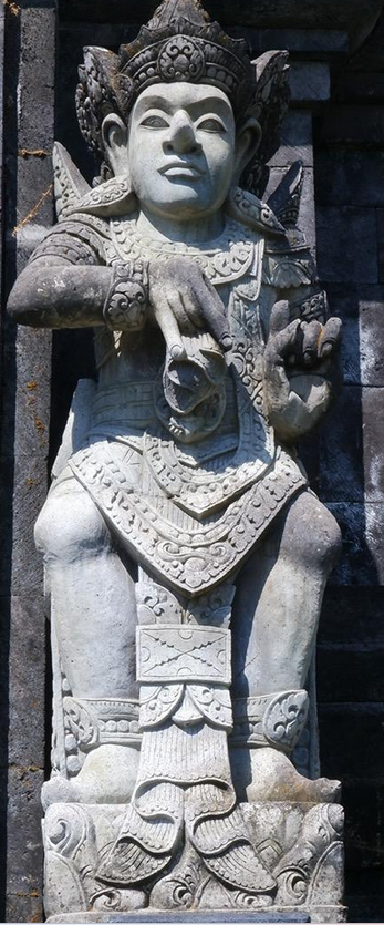 Patung menempati sisi utara bangunan, tepatnya pada Kori Agung 1. Patung dibuat dengan material batu padas Bali warna natural unpolished, dengan dimensi panjang 50 centimeter, lebar 50 centimeter dan tinggi 190 centimeter. Gaya rupa patung menggunakan gaya seni Bali kontemporer dengan teknik pahat.