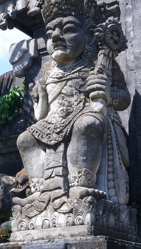Patung menempati sisi utara bangunan, tepatnya pada candi bentar. Patung dibuat dengan material batu padas Bali warna natural unpolished, dengan dimensi panjang 70 centimeter, lebar 70 centimeter dan tinggi 210 centimeter. Patung ditempatkan secara otonom terpisah dengan struktur arsitektur. Gaya rupa patung menggunakan gaya seni Bali kontemporer dengan teknik pahat.