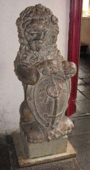 Stone statue of a roaring lion, seated on his back feet, holding a shield displaying the coat of arms of Batavia. Formerly in the Hertogspark, in front of the Volksraad Building (now Gedung Pancasila) but maybe before that in the backyard of the Stadhuis, and before that in the justice place of the Schepenen (de Haan p. 664)
