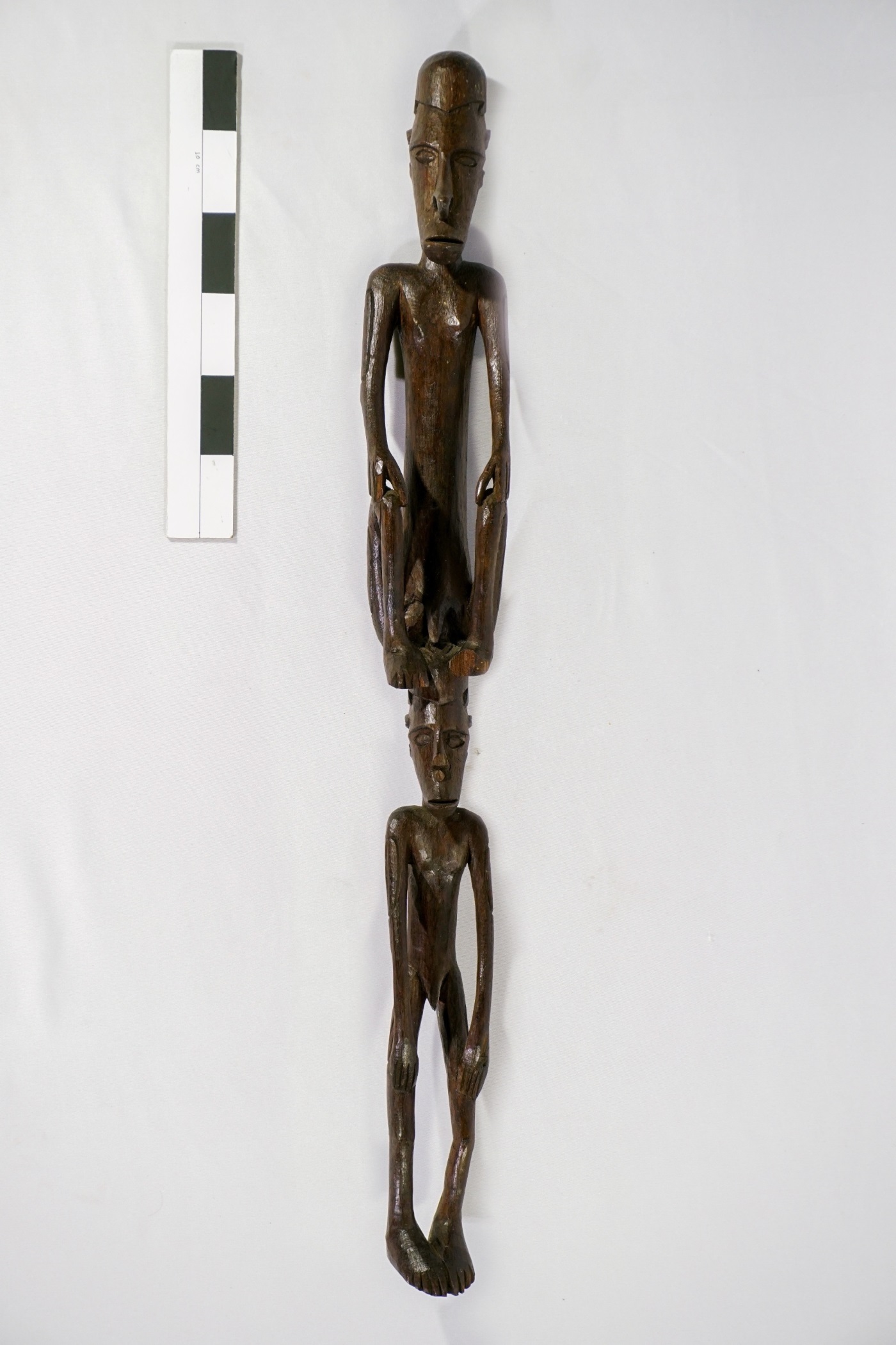 Patung bergambar manusia dengan corak kebudayaan suku Asmat ini merupakan benda pribadi milik Prof. Dr. R. Soegarda Poerbakawatja. Persinggungannya dengan Papua bermula dari tugas mendirikan perguruan tinggi pertama disana yaitu Universitas Cendrawasih pada 1962. Meski tugas sebagai rektor Universitas Cendrawasih hanya dijalani 4 tahun, namun kecintaan Profesor Sugarda terhadap Papua terus bertahan. Terbukti sejumlah karya seni bercorak budaya Papua menghiasi ruang kerjanya di Jakarta.