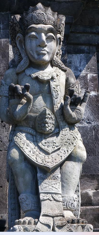 Patung menempati sisi timur bangunan, tepatnya pada Kori Agung 1 yaitu bagian nistaning utama bangunan. Patung dibuat dengan material batu padas Bali warna natural unpolished, dengan dimensi panjang 50 centimeter, lebar 50 centimeter dan tinggi 210 centimeter. Gaya rupa patung menggunakan gaya seni Bali kontemporer dengan teknik pahat.