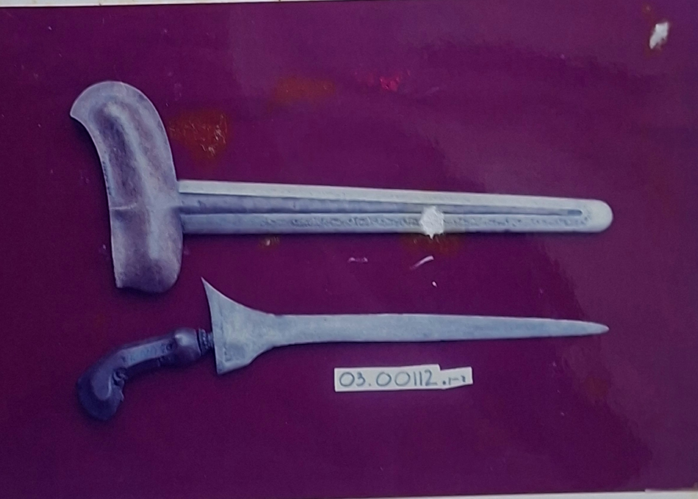 Berbentuk bola dengan diametr 9,46 cm berat 4 kg, permukaan kasar dan tidak terdapat lubang kecil berbahan besi logam berwarna coklat keabu-abuan, dibuat dengan tehnik cetak