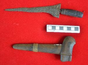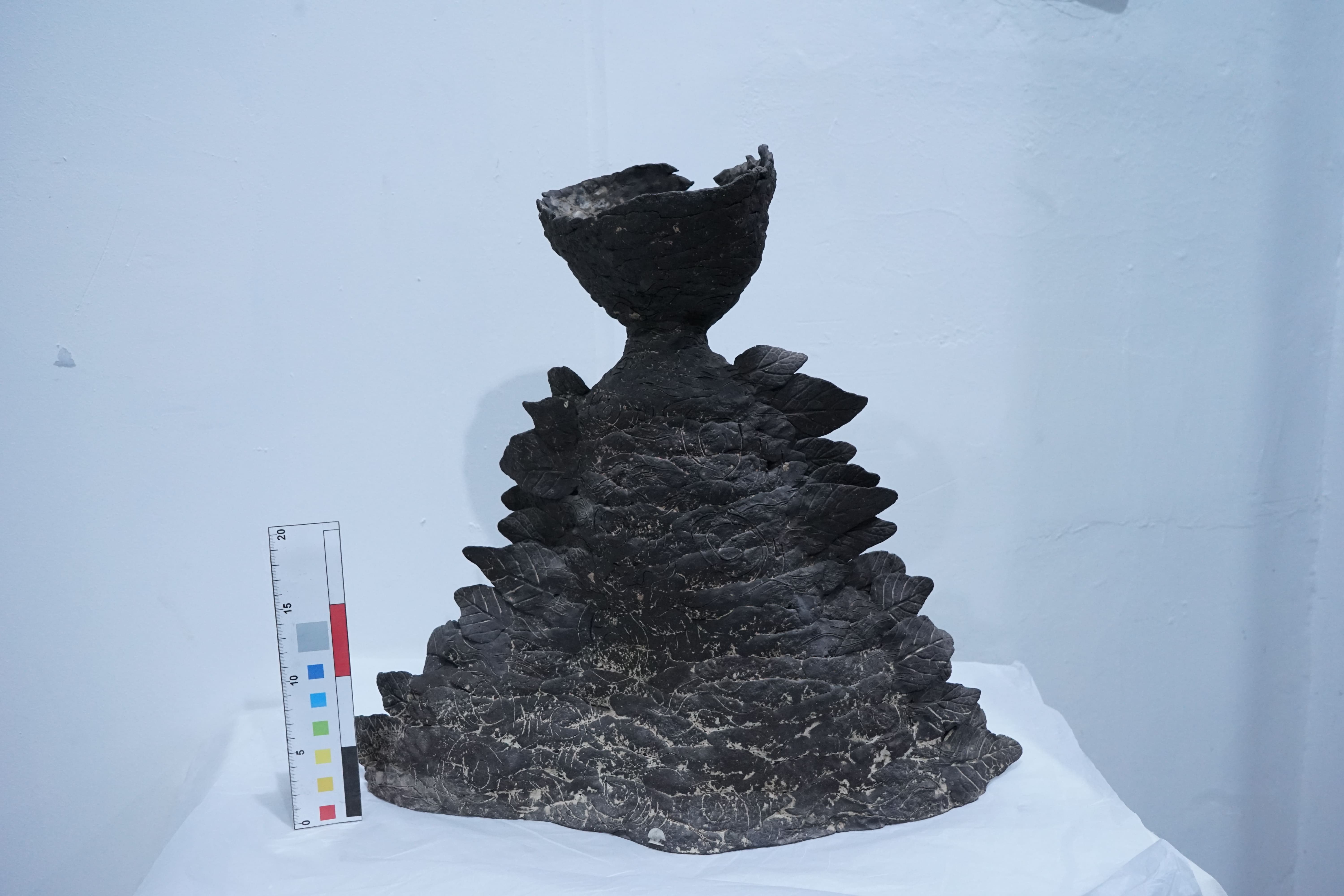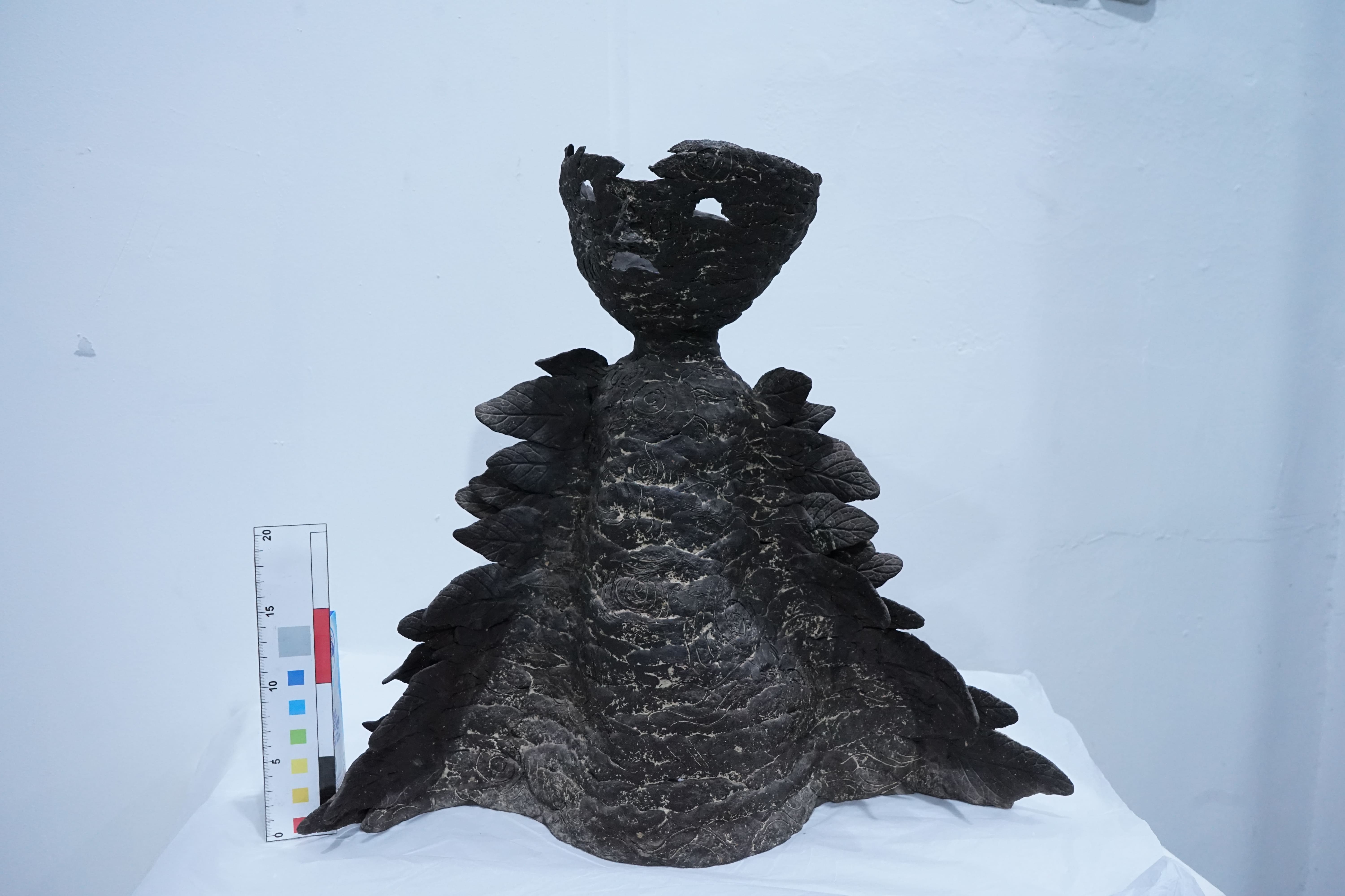 "Noor Sudiyati Peri Daun #10 Seni Kriya 0339/SK/D Deskripsi: Koleksi ini memiliki bentuk tubuh layaknya peri yang memiliki anatomi wajah seperti mulut, hidung, mata, dan memiliki sayap atau menyerupai jubah yang dikelilingi oleh ornamen daun. Koleksi ini didominasi oleh warna abu kehitaman pada bagian seluruh tubuhnya. Lalu warna putih pada setiap rongga di tubuhnya. Koleksi ini memiliki motif pada kepala berbentuk ornamen layaknya mahkota yang tersusun dari bahan dasar tanah liat dan terdapat motif spiral pada bagian kepala dan wajah. Pada bagian tubuhnya dikelilingi oleh ornamen yang berbentuk seperti rongga daun. Pada bagian seluruh badan terdapat motif floral dan spiral. Pada bagian sayap kanan dan kiri terdapat ornamen daun yang ditempel. Pada bagian wajah memiliki bentuk layaknya mangkuk. Pada bagian sayap kanan terdapat 13 ornamen daun. Pada bagian sayap kiri ditempel sebanyak 16 ornamen daun. Keseluruhan koleksi ini menggunakan teknik ditempel, sehingga menghasilkan motif yang berupa garis-garis dan berlapis. Terdapat ruang berlubang dari atas wajah hingga ke bawah tubuh. Pada tiap bagian badannya terdapat beberapa motif rongga daun, diduga daun ditempelkan saat tubuh koleksi masih agak sedikit basah, maka dari itu terdapat motif layaknya rongga daun. Tubuh koleksi seperti punden berundak karena memiliki konstruksi tubuh dari bawah membesar kemudian mengerucut ke atas. Koleksi ini memiliki raut wajah yang murung, hal ini dibuktikan dengan mulutnya yang tersenyum ke bawah. Noor Sudiyati, perupa dan keramikus kelahiran Magelang pada tanggal 14 November 1962 ini menamatkan pendidikan S1 di ISI Yogyakarta pada tahun 1989, pendidikan S2 di ISI Yogyakarta pada tahun 2003, dan mengenyam pendidikan S3 di Universitas Gadjah Mada pada tahun 2012. Noor Sudiyati memulai pameran tunggalnya pada tahun 1997 dengan tema “Ekspresi Tanah Liat” Bentara Budaya Yogyakarta, Tahun 1999 dengan tema “Ceramic, Art & Contemplation” KInara Galeri Bali, Tahun 2001 dengan tema “Dari Tanah ke Tanah” Galeri Lontar Jakarta, Tahun 2003 dengan tema “Bermula dari Segitiga” Pascasarjana ISI Yogya, Tahun 2004 dengan tema “Ritus Daun”, Edwin Galeri Jakarta. Serta melakukan beberapa pameran bersama pada tahun 2006 dengan tema “Pameran Qualisign, Kriya, Kontemporer” Surabaya, Tahun 2007 Pameran 100 Tahun Affandi, Yogyakarta, dan Tahun 2008 Pameran Keramik di Darwin, Australia."