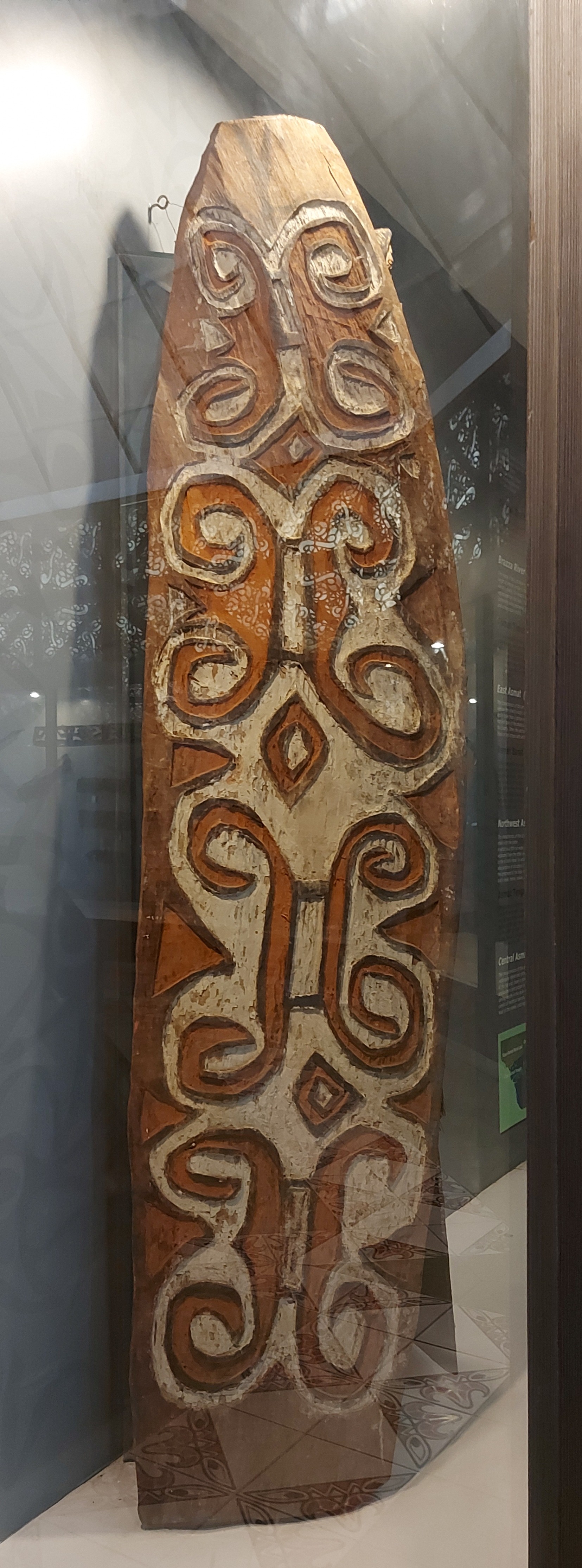 Asmat, yang merupakan salah satu suku di Papua terkenal dengan hasil ukirannya yang khas. Salah satu hasil kreativitas suku Asmat yang terkenal sampai mancanegara adalah perisai. Pembuatan perisai atau dalam bahasa daerah Asmat disebut dengan Jamasj biasanya diawali dengan upacara yang disebut Jamasj Pokmbui. Perisai dibuat dari akar penopang pohon besar atau pohon mangrove yang kemudian diukir dengan motif-motif asmat dengan makna tertentu dan diberi warna merah, putih, hitam atau warna asli kayu. Warna putih didapat dari lumpur merah, warna putih berasal dari kulit kerang yang ditumbuk dan warna hitam berasal dari arang. Fungsi utama perisai digunakan sebagai alat pertahanan dan perlindungan dari serangan senjata musuh. Suku Asmat percaya bahwa perisai mempunyai kekuatan magis yang dapat mempertahankan atau melindungi pemiliknya.