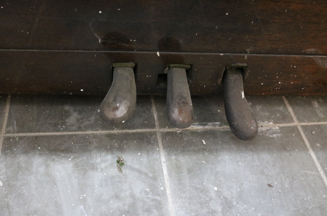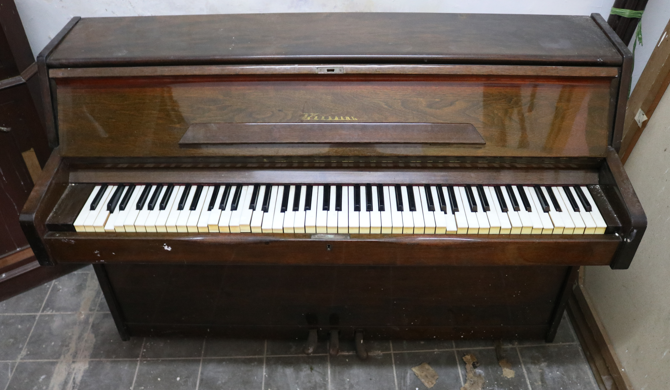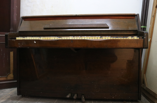 Sebuah piano bermerek Blessing. Piano berbahan kayu jati berwarna coklat. Keyboard berwarna hitam dan putih. Terdapat tiga pedal di bagian bawah dengan kondisi pedal kiri sudah tidak bisa dinaikkan. Kondisi keyboard masih utuh, tetapi sebagian besar sudah rusak. Bagian tengah piano terdapat lubang kunci. Kondisi piano bernoda.