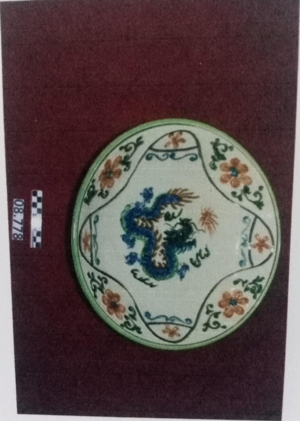 Terbuat dari porselin warna putih, retak seribu, bentuk bulat cekung, bagian pinggir/bibir berles biru dan bibir bergelombang.