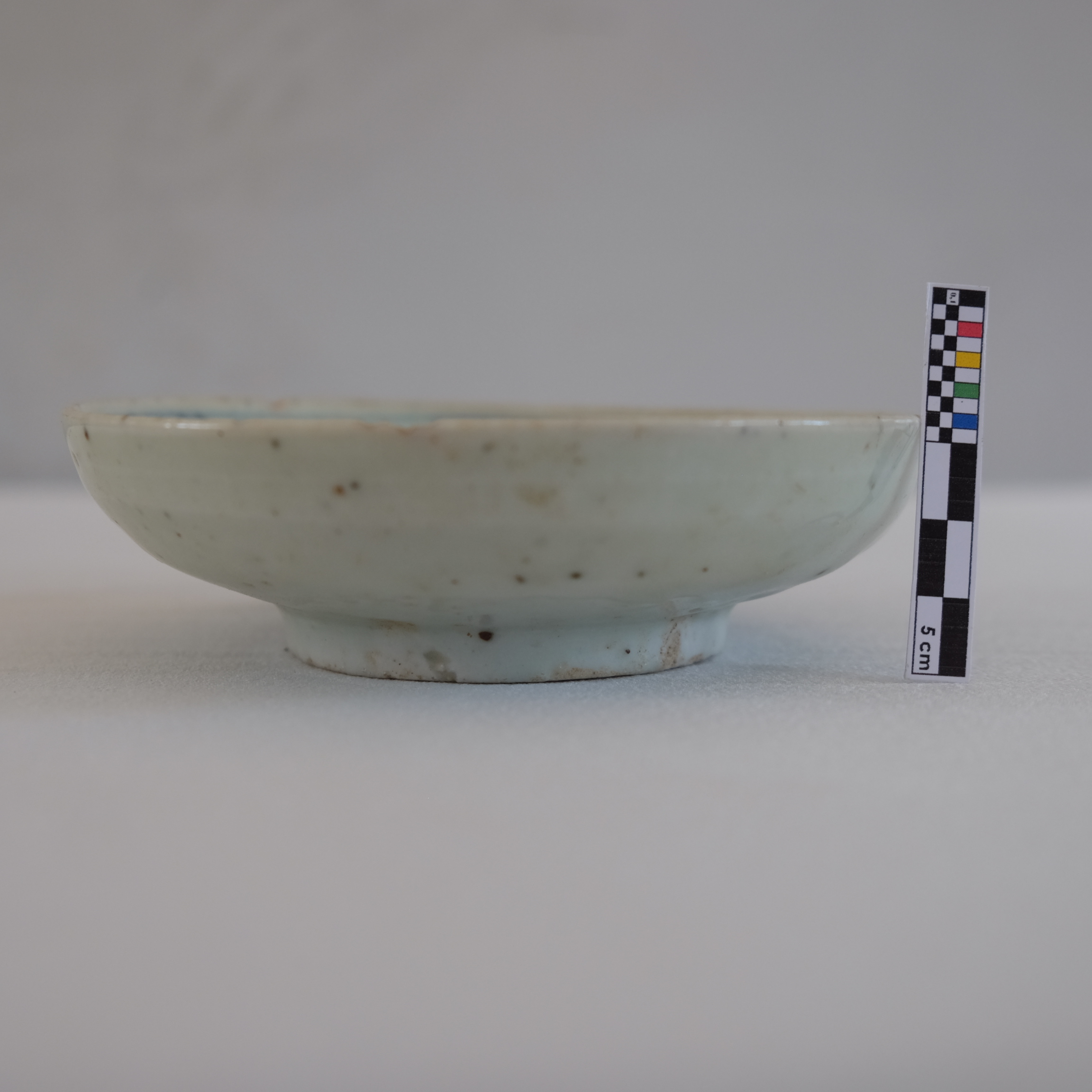 Memiliki warna dasar putih dengan motif berupa pemandangan alam dan bangunan berwarna biru. Permukaannya telah di glasir secara menyeluruh. Keramik ini dibuat dengan teknik roda putar yang terlihat dari striasi pada sisi luar.