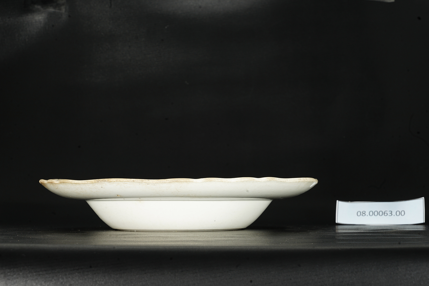 piring keramik, sebuah piring keramik ukuran sedang (piring makan), bentuk cembung, pinggir bergelombang, warna dasar putih, hiasan motif suluran (bunga dan daun) warna merah, hijau dan hitam