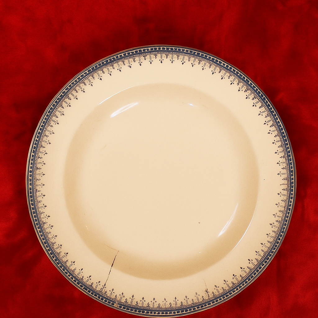 Piring bulat lebar terbuat dari bahan keramik. Terdapat hiasan glasir pada bibir piring dengan warna dasar putih