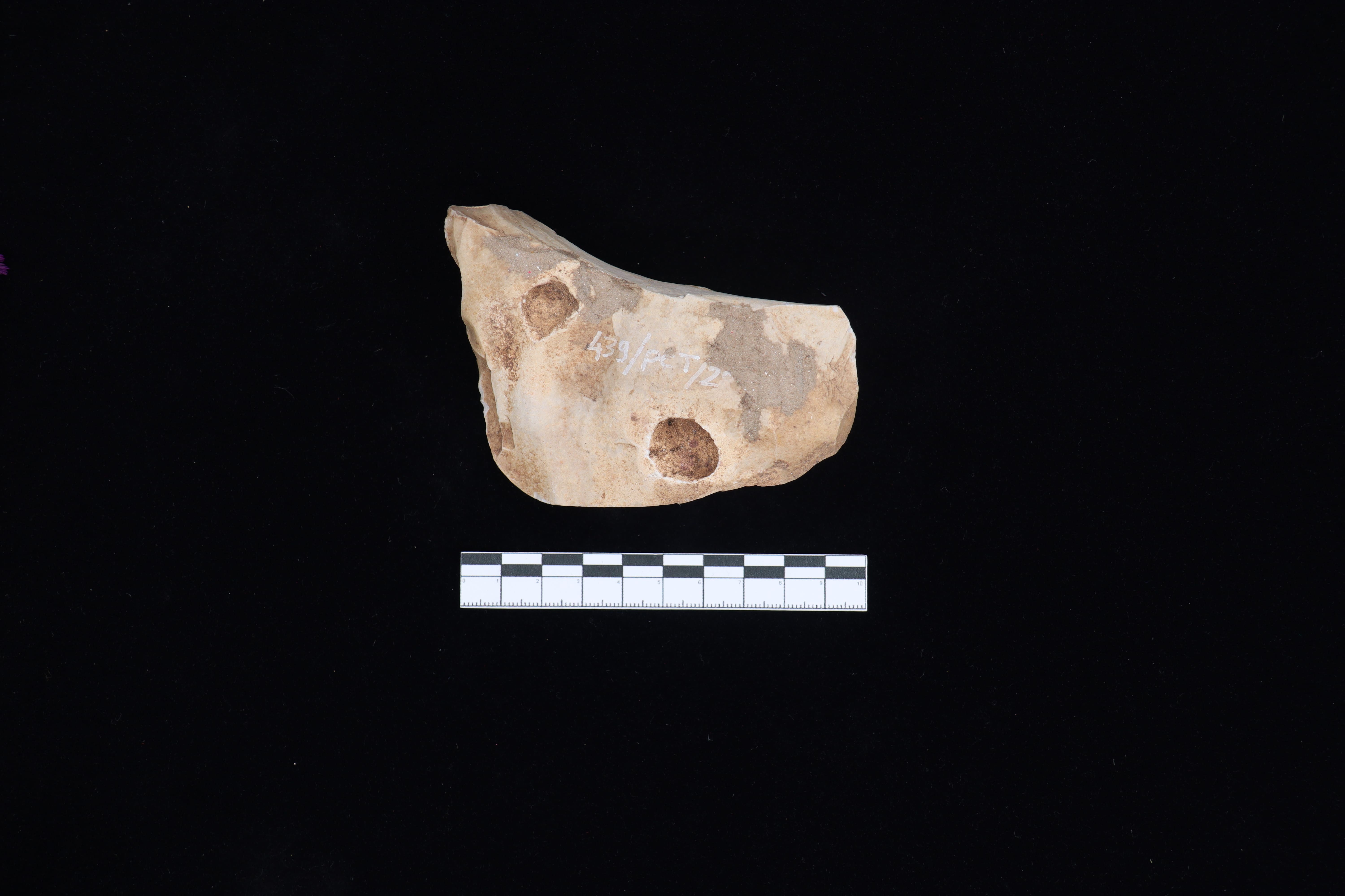 Piring keramik berglasir dengan warna dasar putih berbentuk bundar. Memiliki motif hias flora dan fauna dengan warna biru tua. Terdapat 6 (enam) panel motif hias dengan masing – masing bergambar pedang, flora, dan lembar naskah. Serta tengah objek memiliki motif hias fauna (burung dan naga)
