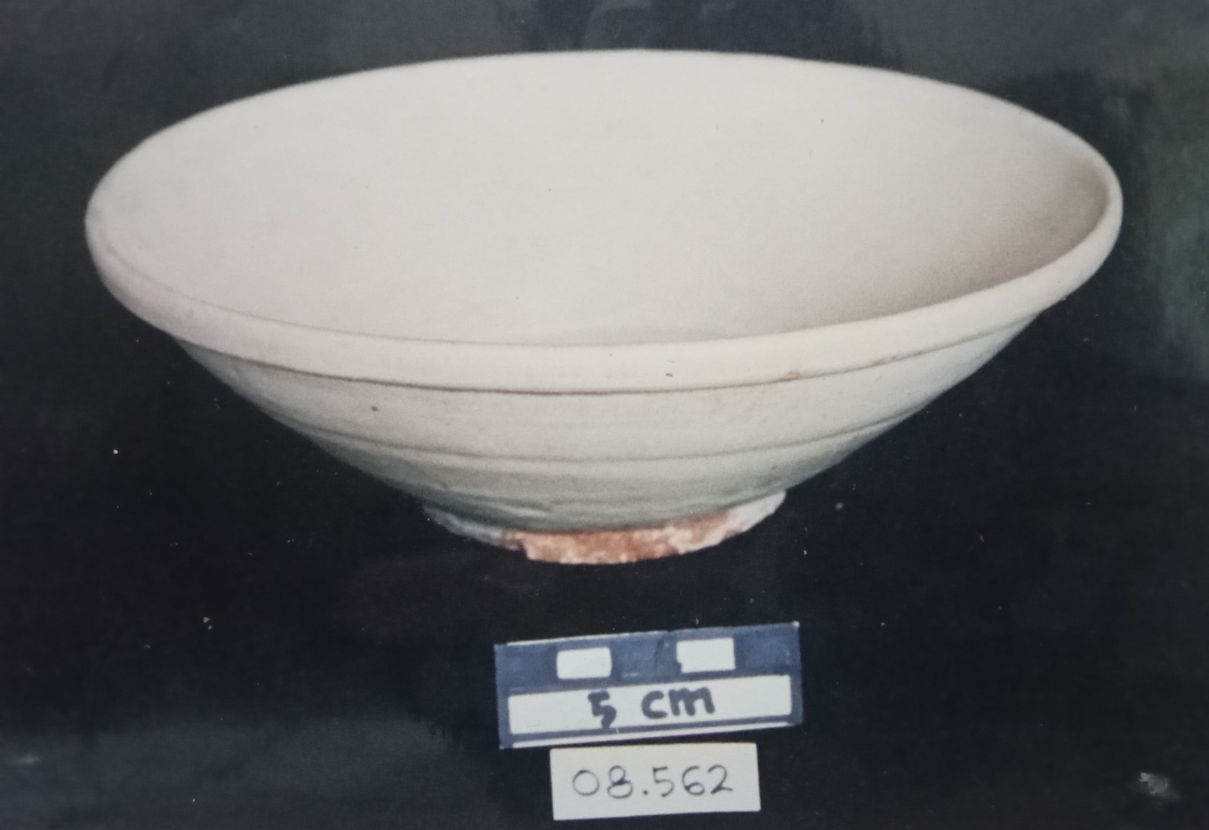 Piring keramik putih dengan motif hias tumbuhan (rangkaian kelopak bunga) berwarna coklat dan merah serta motif inisial huruf. Kondisi piring dalam keadaan utuh.