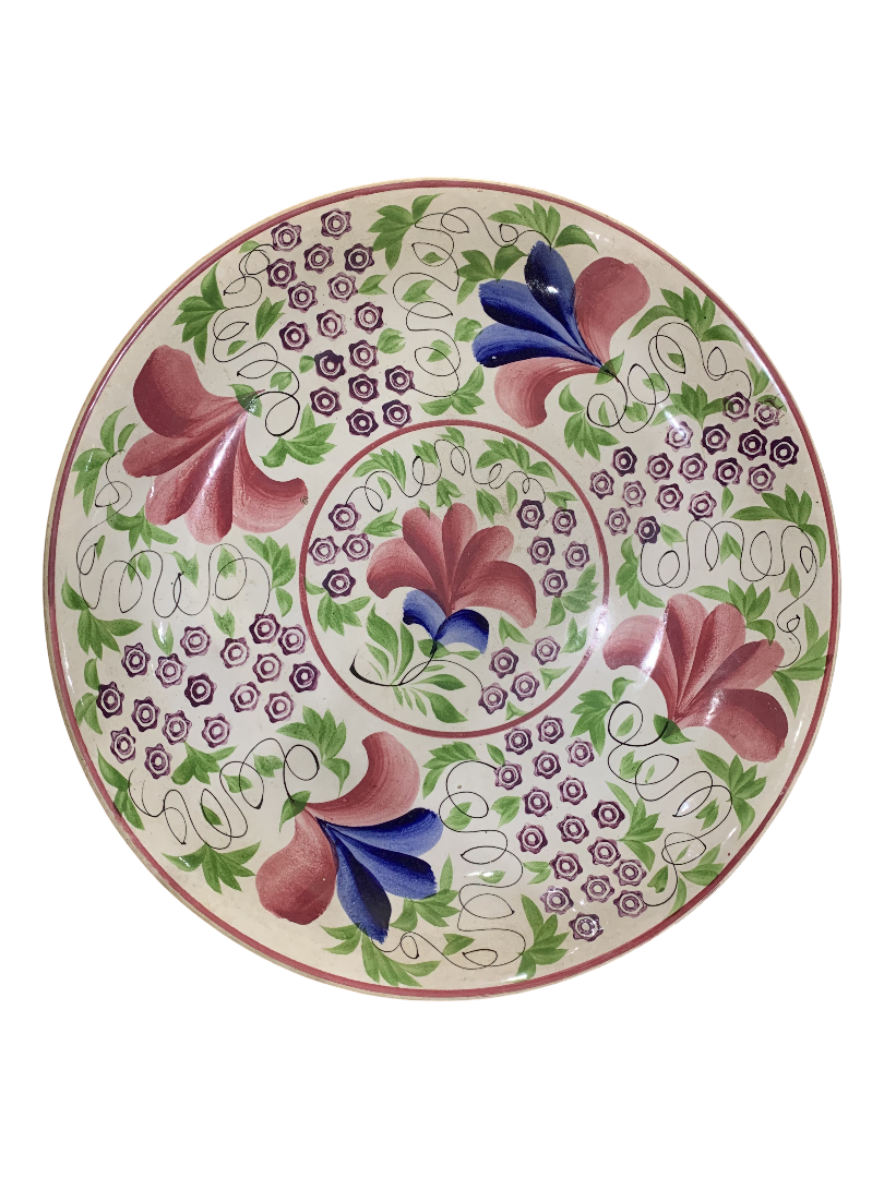 Bulat cekung dengan lingkaran kaki rendah, dengan warna dasar putih, piring ini mempunyai hiasan dengan motif bunga-bunga warna merah, biru dan ungu dan daun berwarna hijau dan motif lingkaran. Piring ini diperkirakan dibuat di Inggris pada abad ke-18 Masehi hingga awal ke-20 Masehi.