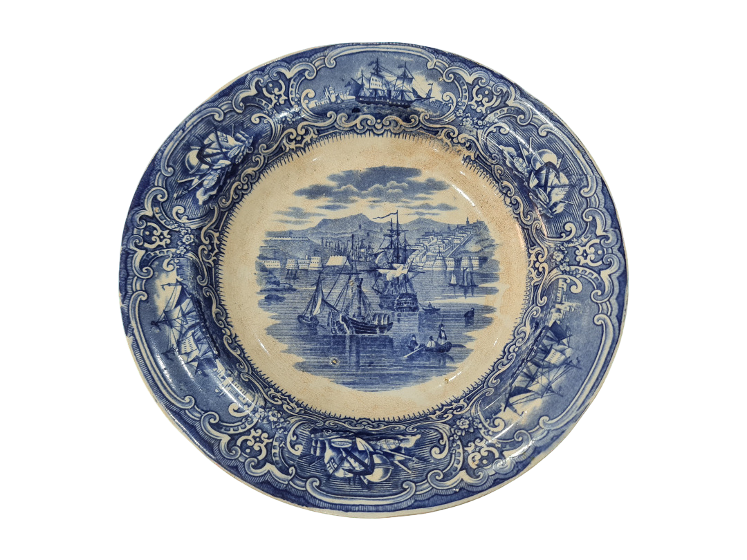 Terbuat dari tanah liat, berbentuk bundar dengan permukaan sedikit cekung, dan berglasir sempurna putih-biru. Pada permukaan dalam tengah dan bibir piring terdapat hiasan berupa pemandangan pelabuhan dan kapal layar. Piring ini diperkirakan dibuat di Eropa pada abad ke 19 hingga awal abad ke-20 masehi.