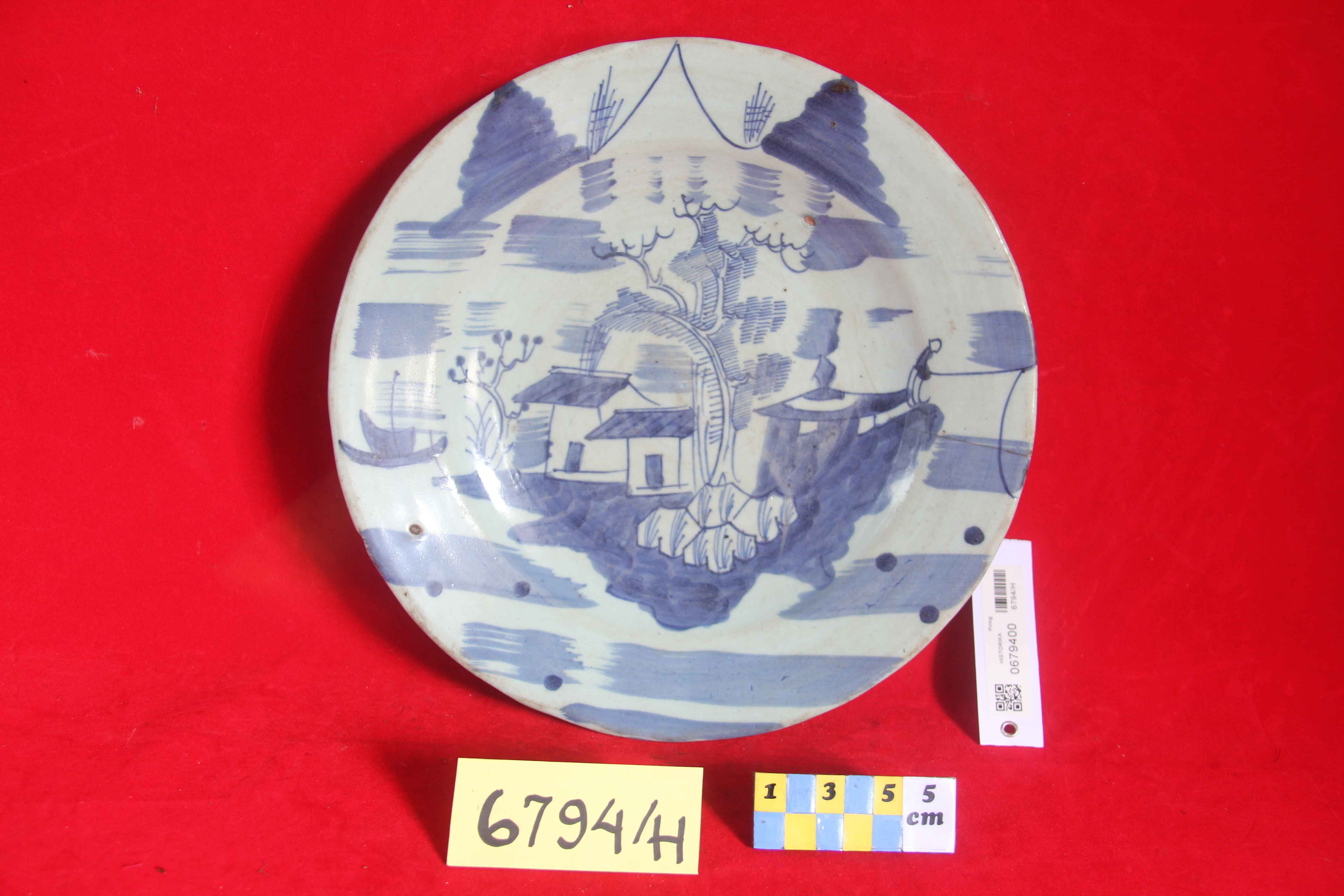 Bahan kaolin/ tanah liat, bentuk bulat agak cekung , berkaki dengan warna dasar putih kebiruan (warna telur bebek). Pada bagian depan din ding dihiasi motif pemandangan alam yaitu rumah,,pohon, perahu, awan dll didominasi warna biru. Bagian dasar rata dan terera tulisan cina atau ap pabrik .